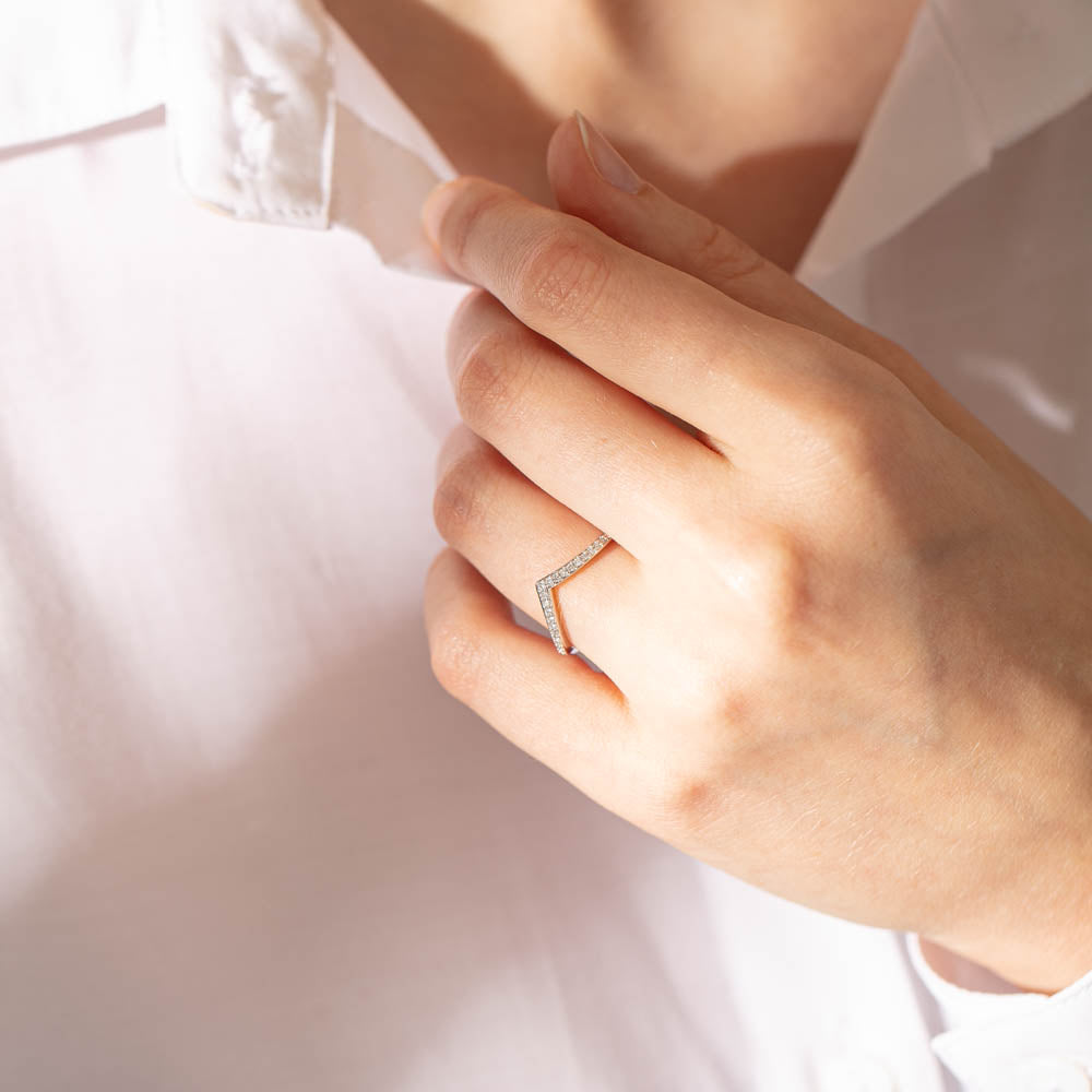 Whether on its own or as part of a ring stack, this stylish 14ct white gold Chevron band sparkles with 21 round brilliant cut diamonds running along the gentle curve of its chevron shaped design.