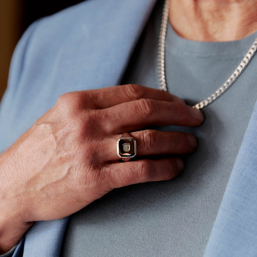 A luxurious signet ring crafted in 14ct white gold set with a radiant cut diamond.