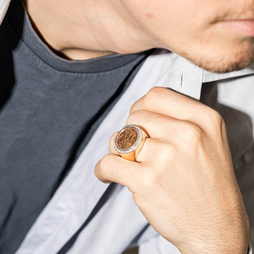 14ct yellow gold half sovereign ring boasts one 22ct yellow gold half sovereign framed by a halo of forty eight round brilliant cut diamonds set in 14ct yellow and white gold. A bold statement piece that exudes luxury.