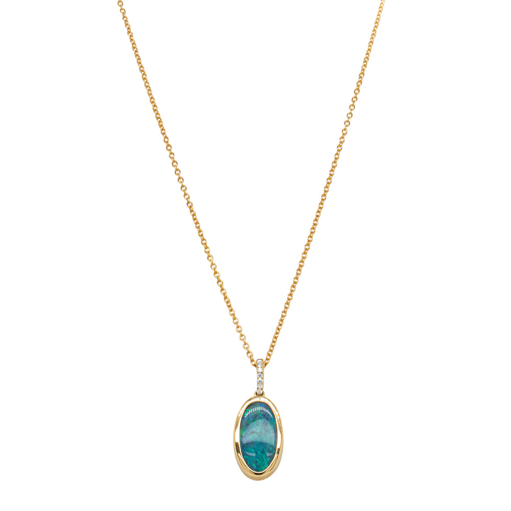 14ct yellow gold pendant featuring one opal in a rubover setting and a diamond set bail.