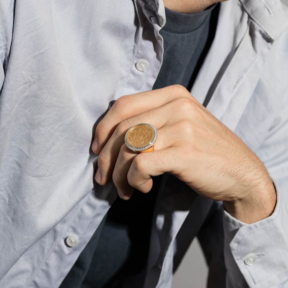 This 14ct yellow gold 1904 sovereign ring boasts one 22ct yellow gold sovereign framed by a halo of fifty four round brilliant cut diamonds set in 14ct yellow and white gold. A bold statement piece that exudes luxury.