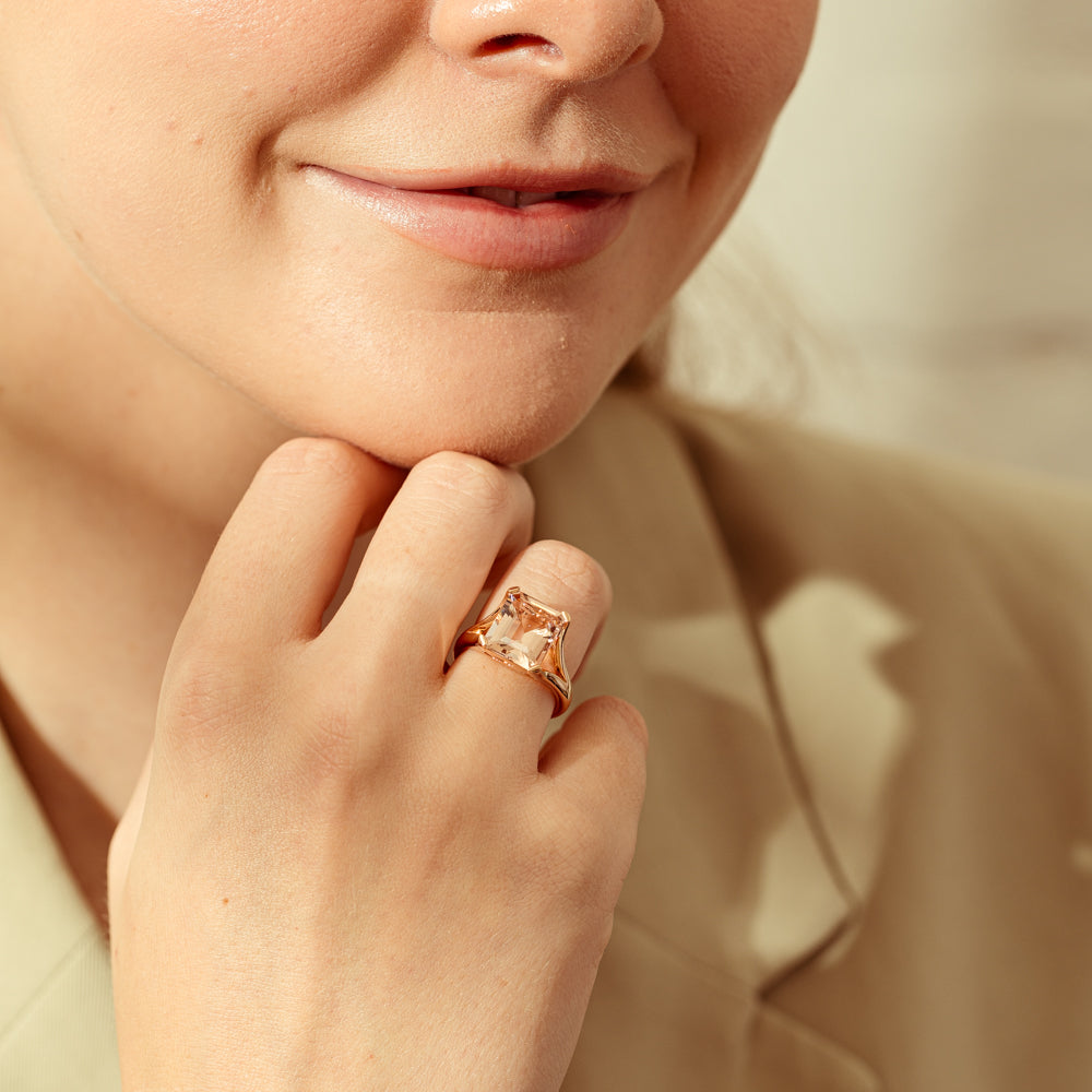 A vision of colour, this 18ct rose gold Verona ring features one dazzling morganite. The rectangular step cut morganite is a light, slightly brownish pink colour. It is simply stunning!