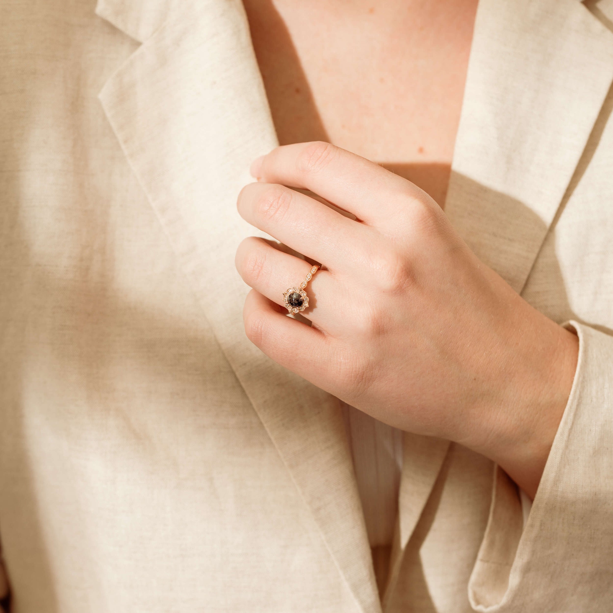 Make it a moment to remember with this striking Paramount ring! Crafted to perfection in 18ct rose gold, this piece boasts a gorgeous .61ct rose cut black diamond framed by a halo of shimmering round brilliant cut diamonds. The perfect ring for the perfect girl.