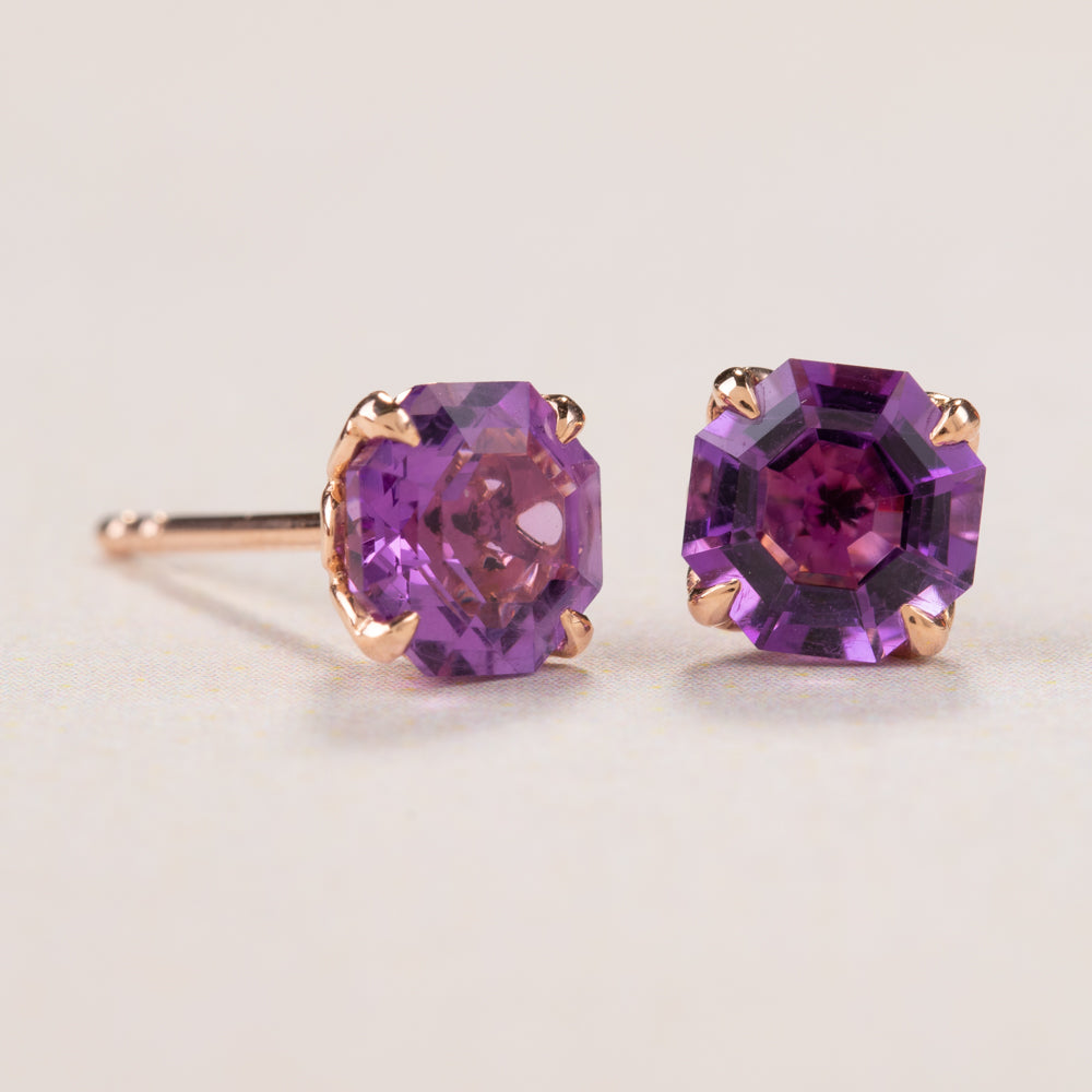 Carefully crafted in 18ct rose gold from our signature 1899 collection, these stunning Octavia stud earrings boast two custom cut eight-sided amethysts resting on a four claw setting.