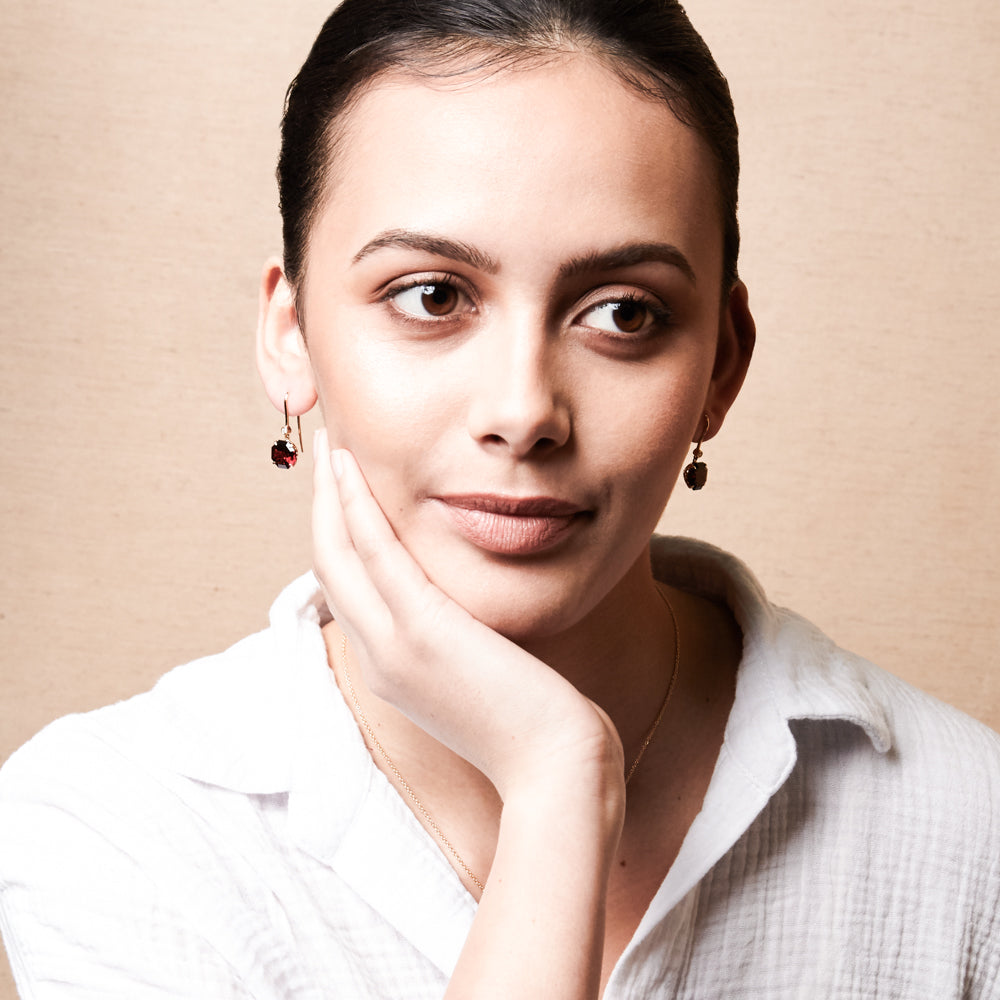 Carefully crafted in 18ct rose gold from our signature 1899 collection, these stunning Octavia drop earrings boast two custom cut eight-sided garnets with two round brilliant cut diamonds.