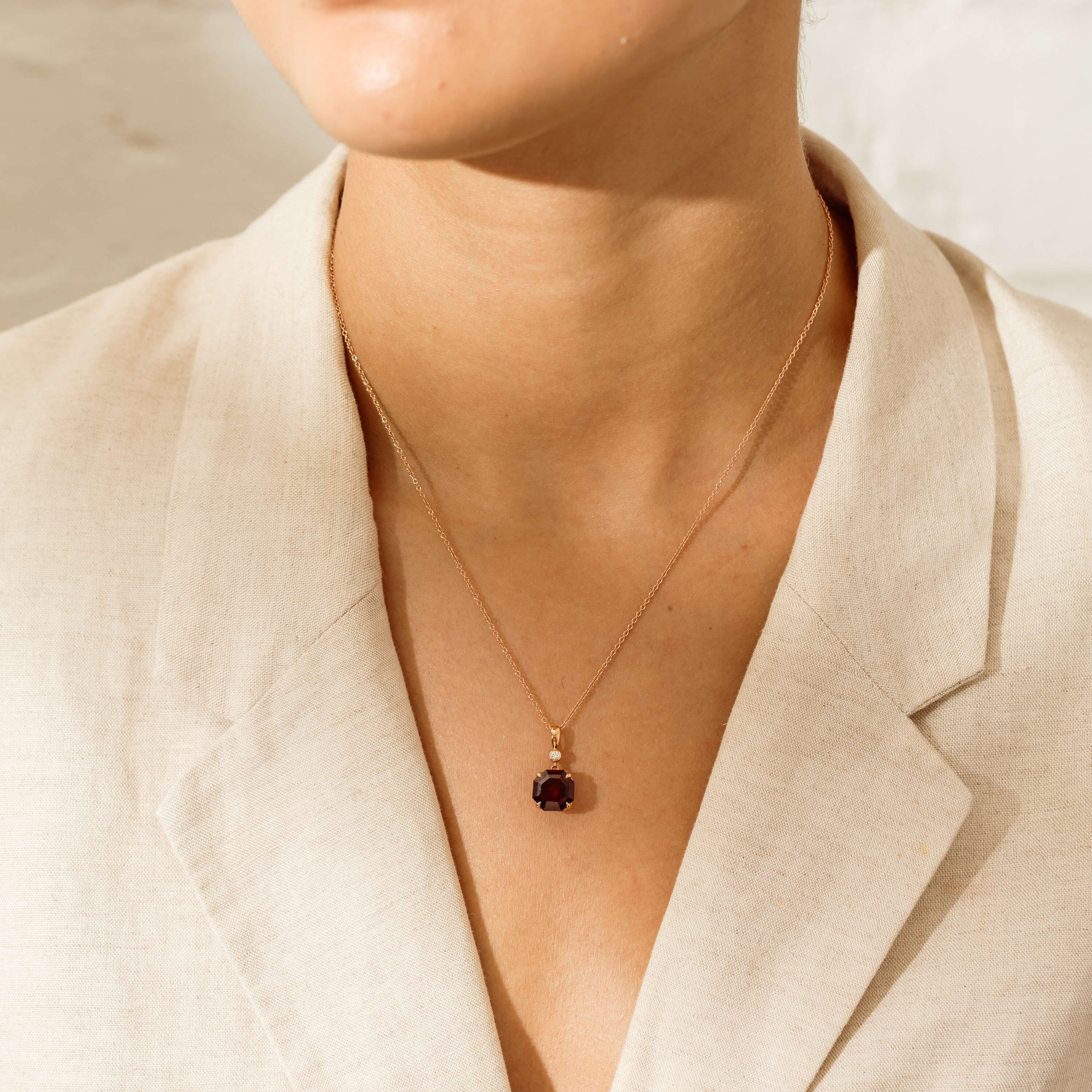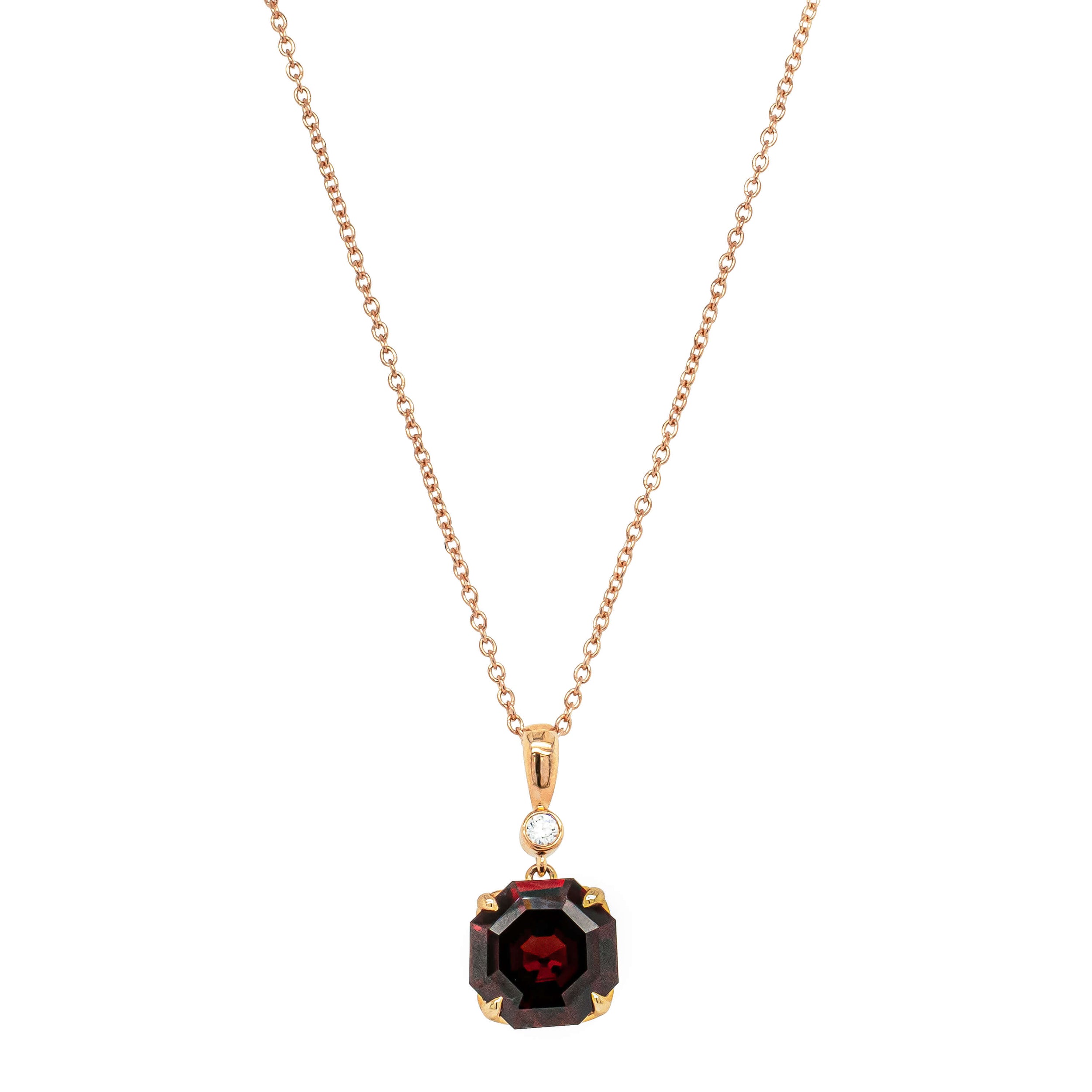 Carefully crafted in 18ct rose gold from our signature 1899 collection, this stunning Octavia pendant boasts a custom cut eight-sided garnet with one round brilliant cut diamond.
