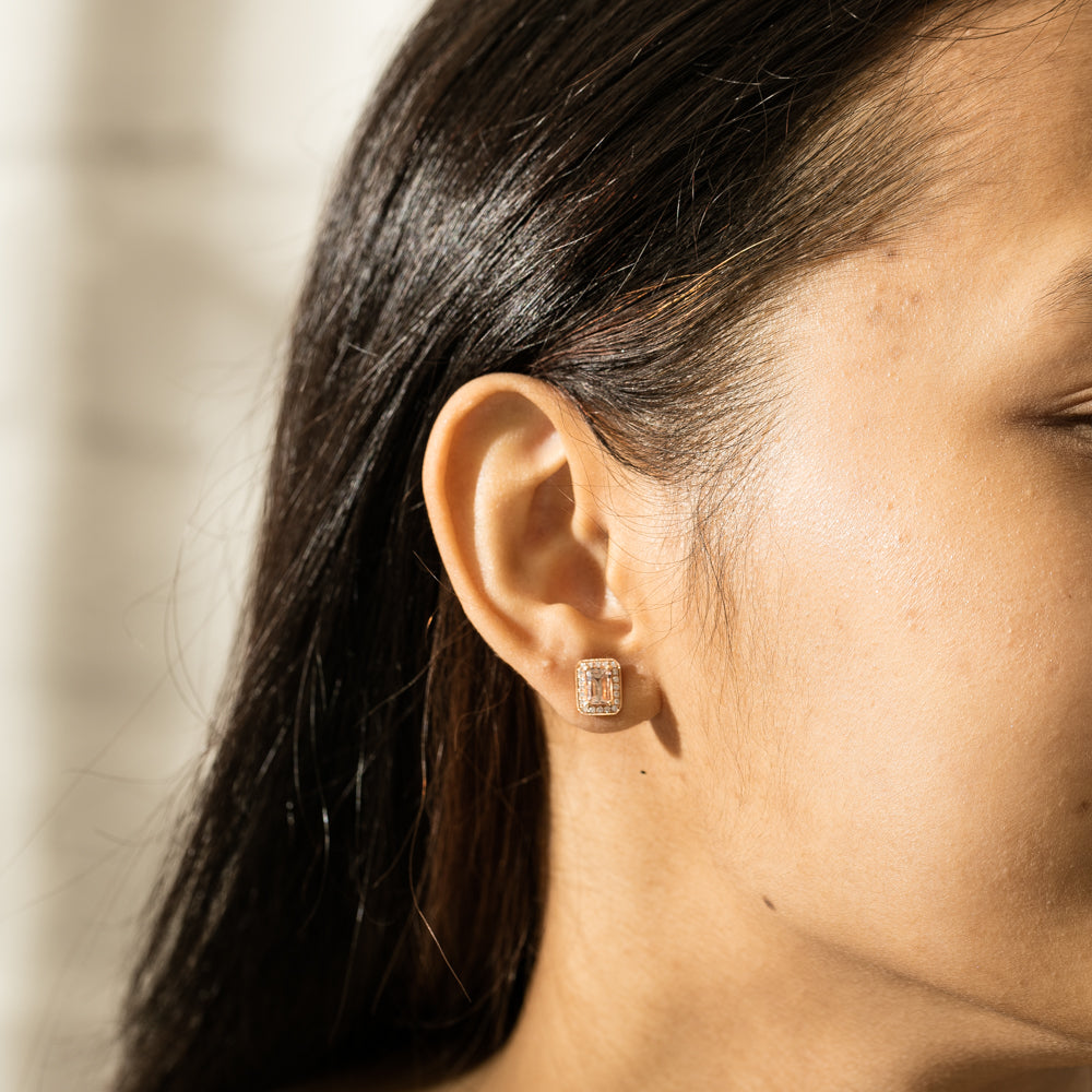 two glistening rectangular step cut morganites with a shimmering diamond halo.