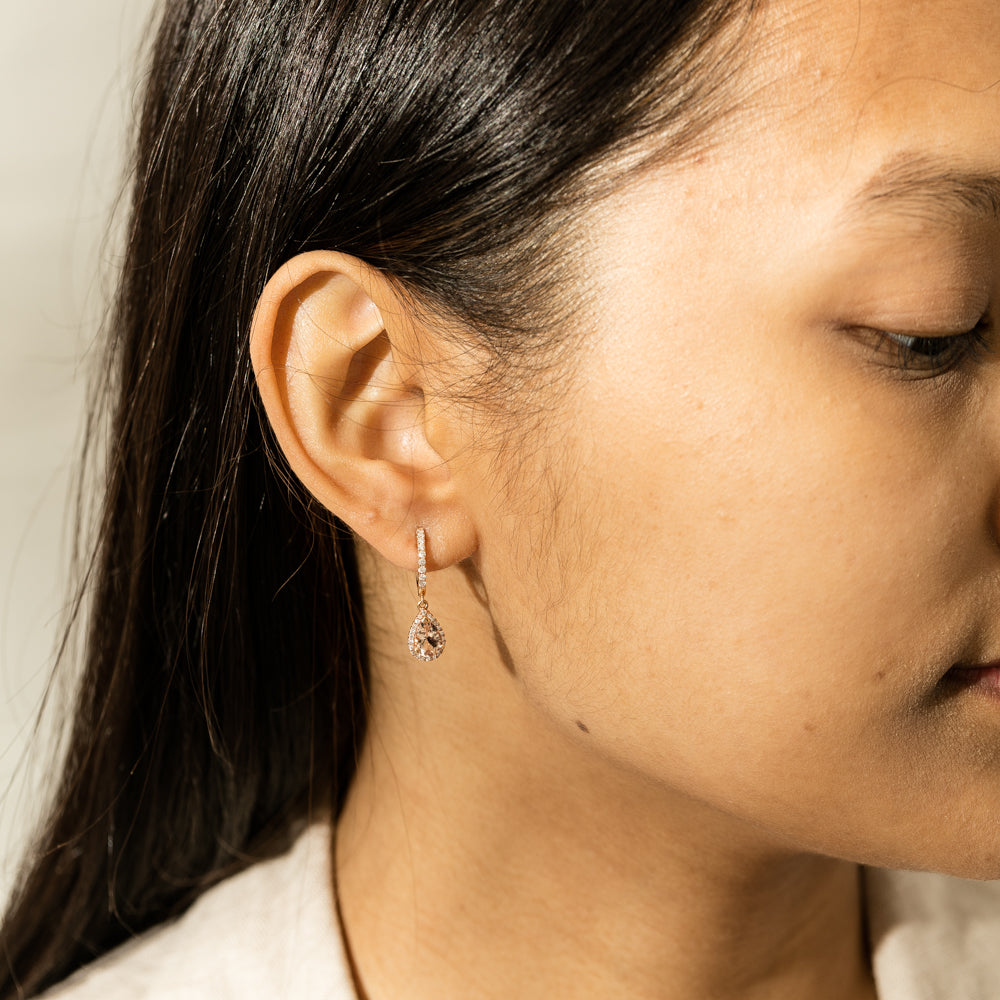 18ct Rose Gold Morganite & Diamond Halo Drop Earrings