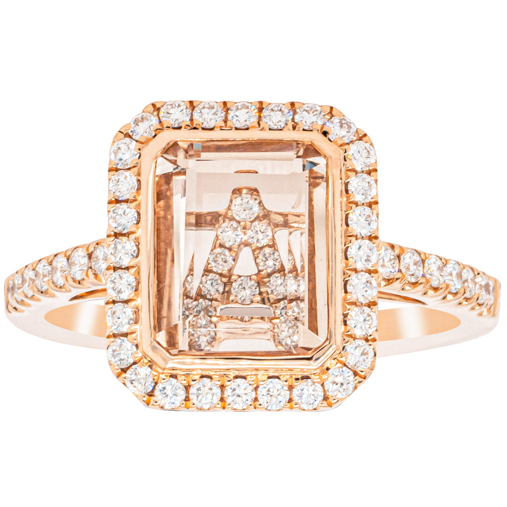 Carefully crafted in 18ct rose gold, this stunning ring boasts a rectangular morganite and diamond cluster over a diamond set 'A' initial showing through the stone.