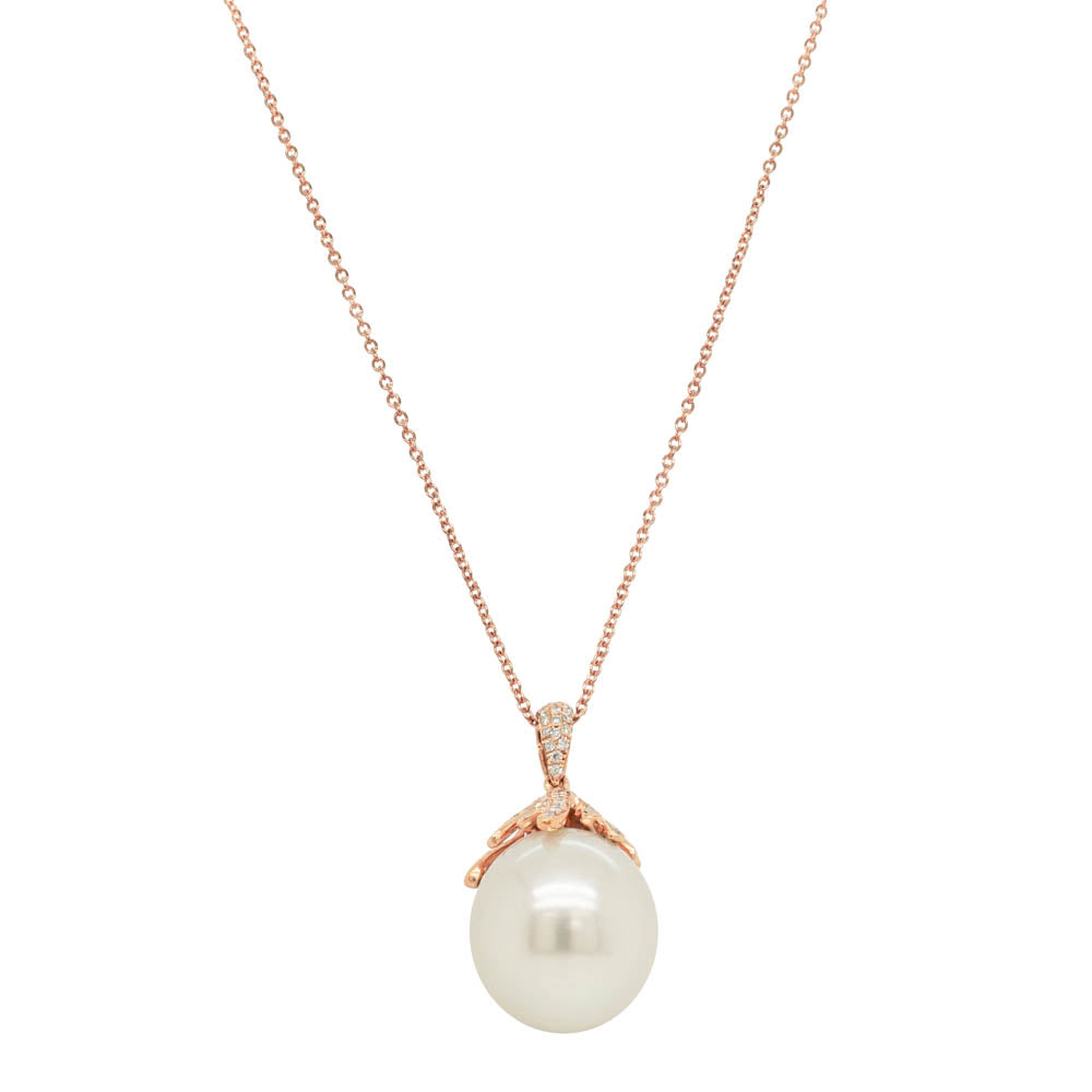 18ct Rose gold pendant features a South Sea Pearl in a diamond set claw style mount.