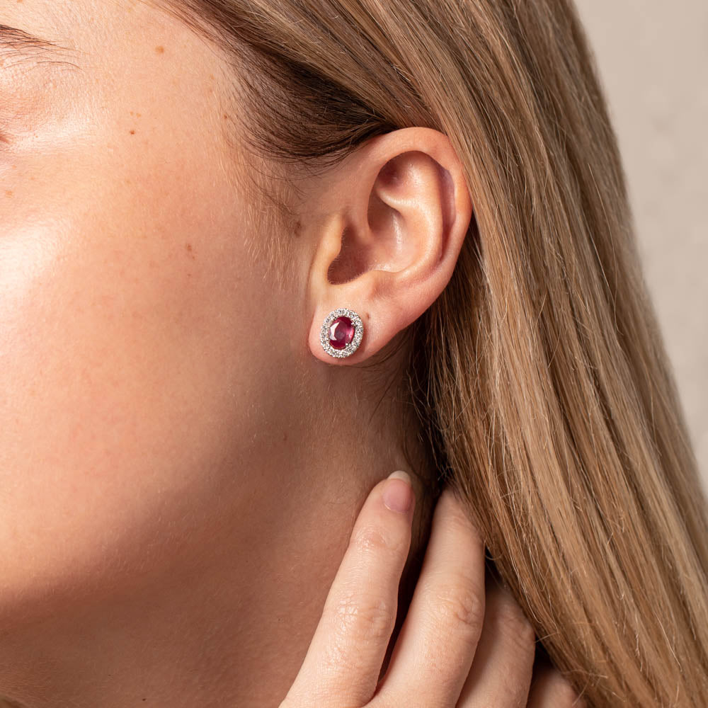 Perfectly set in divine 18ct white gold, these glistening earrings boast two oval faceted rubies surrounded by a glittering diamond halo. Pure sophistication!