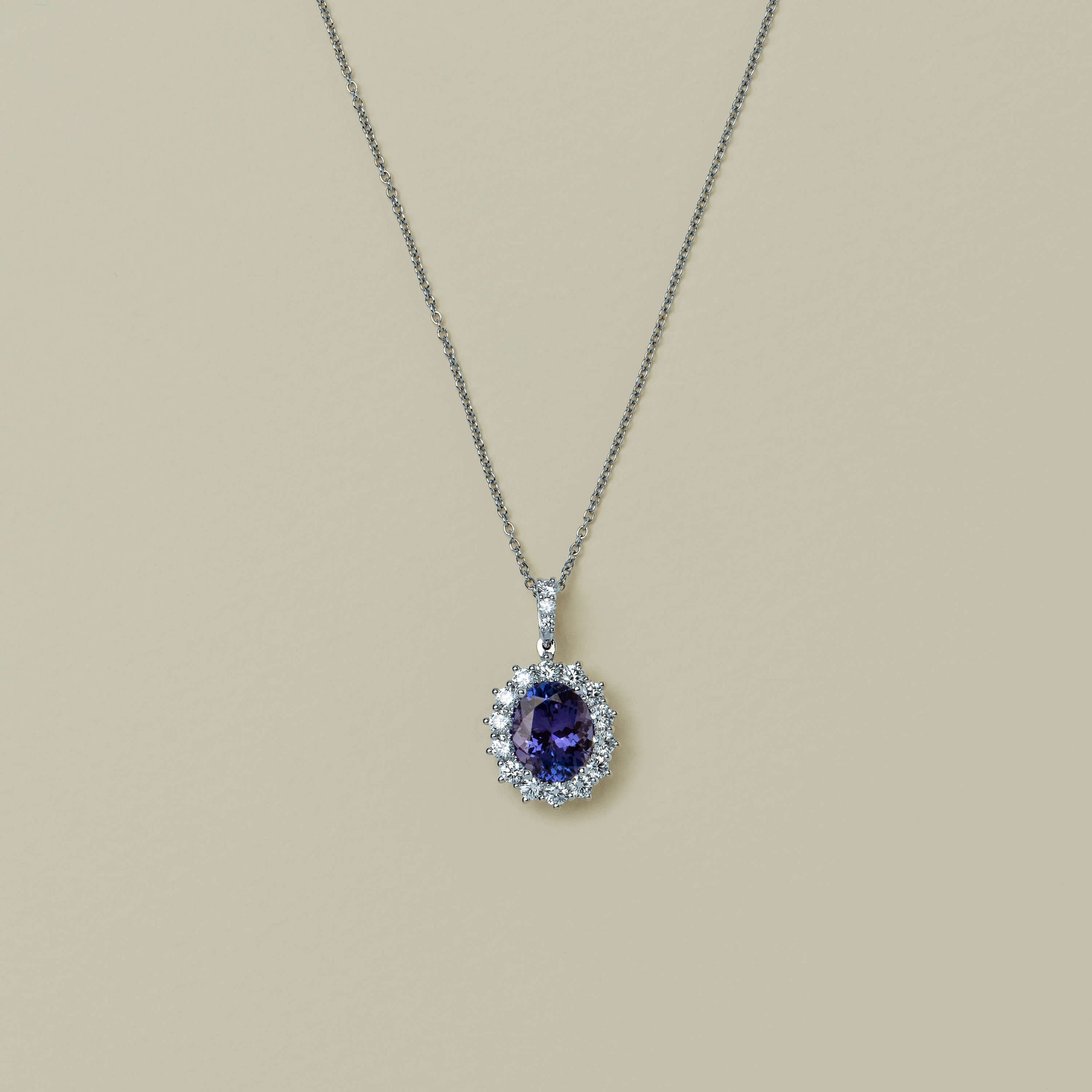 An exquisite update to a timeless classic, this captivating Belle pendant from our signature 1899 collection showcases a stunning 2.68ct oval tanzanite. The tanzanite is gracefully framed by a glittering halo of round brilliant cut diamonds, each meticulously set to enhance the gemstone’s depth and sparkle.