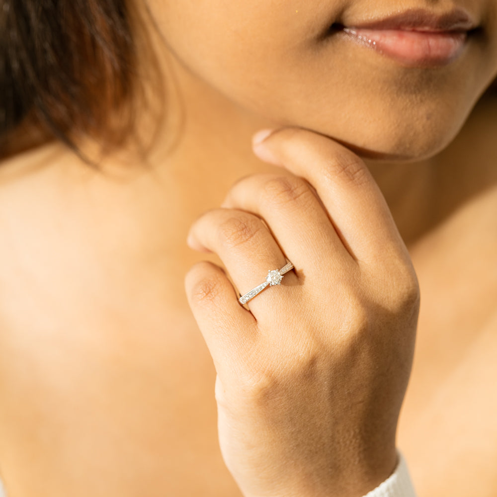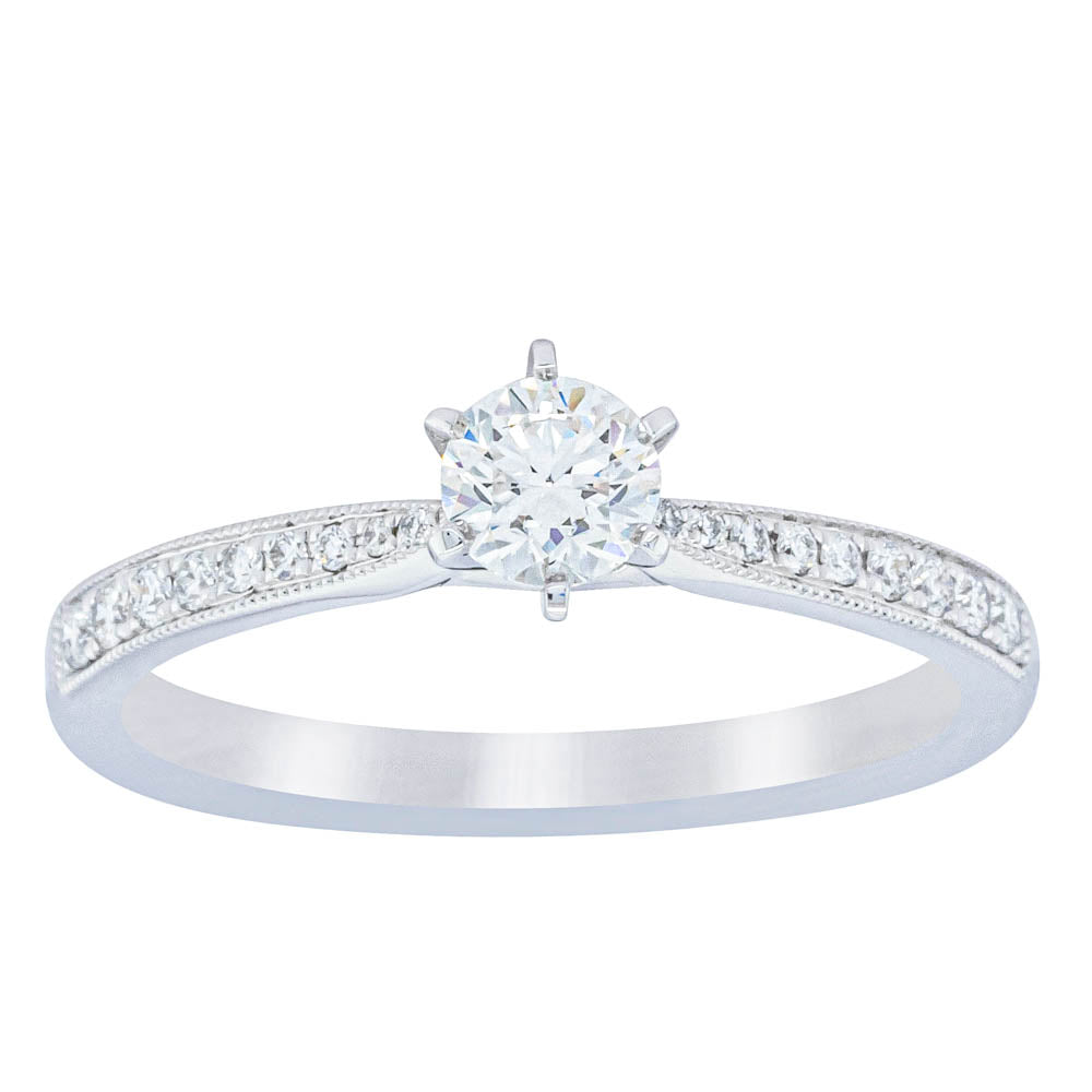A delicate diamond set band with milgrain detailing, tapers towards the zenith to showcase a sparkling diamond.
