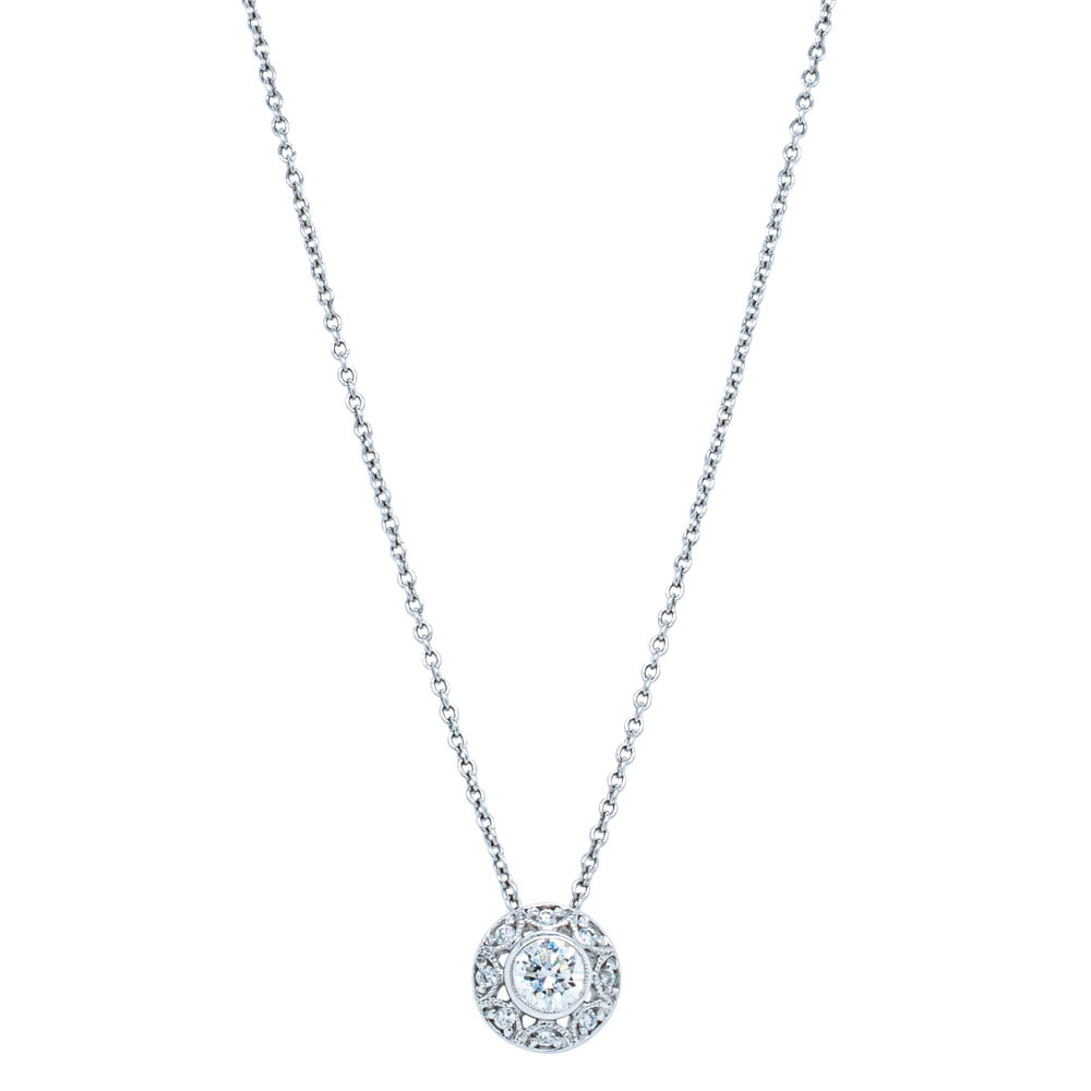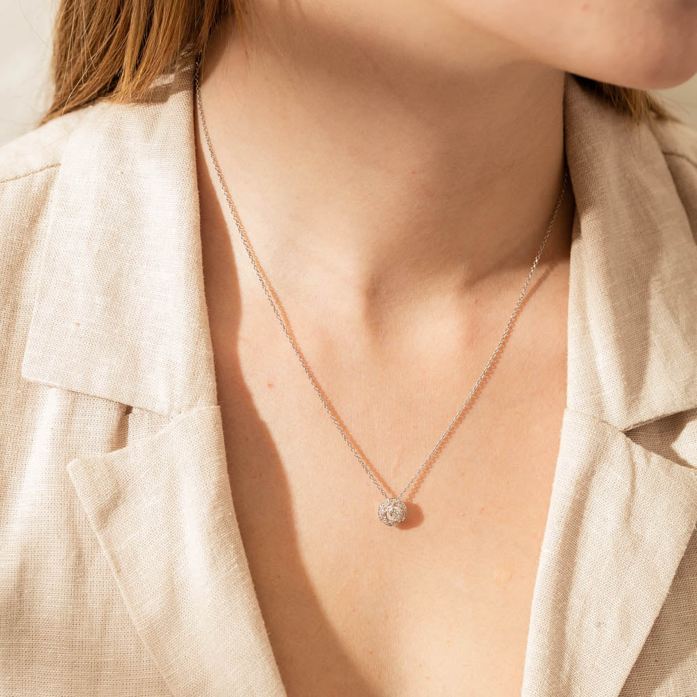 Carefully crafted in 18ct white gold from our signature 1899 collection, this stunning pendant is a part of our unique Snowflake collection and features one .33ct round brilliant cut diamond with a glittering diamond halo.