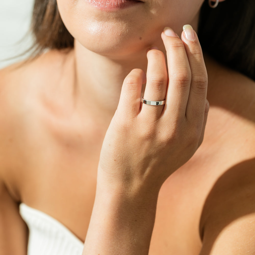 This classic 18ct white gold ring is 3mm wide and has a square profile edge. Available in a standard polished finish (as pictured) or brushed.