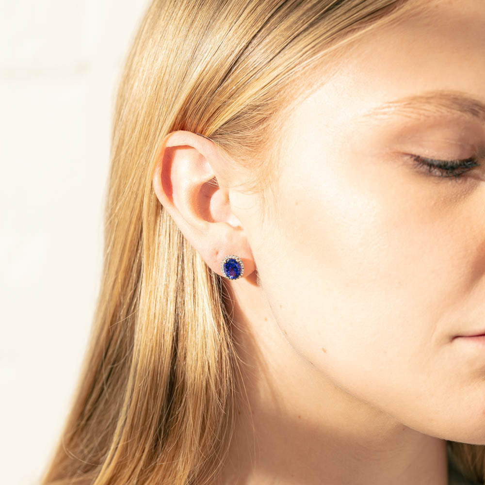 18ct white gold earrings featuring two oval cut tanzanites framed by a dazzling halo of diamonds.