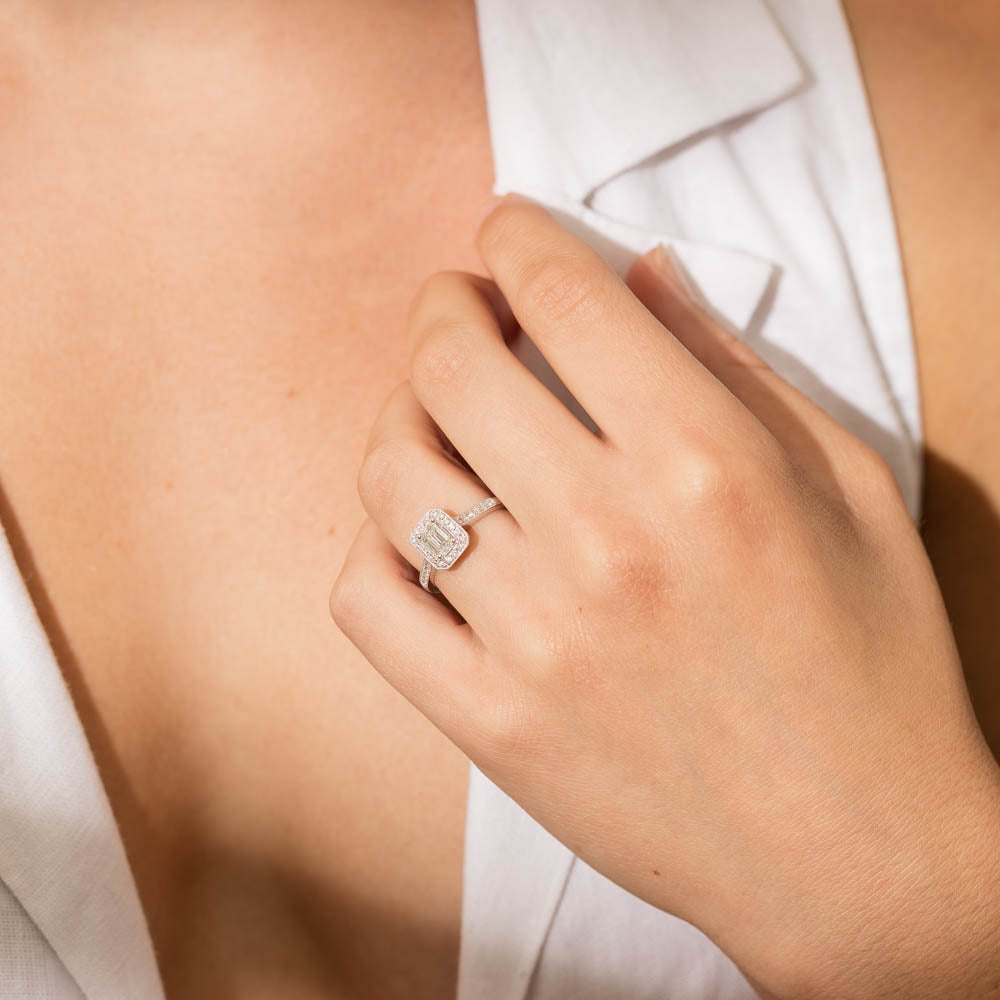 Aria sings with romantic features, a delicate bead set diamond halo and milgrain detailing all highlight an elegant emerald cut diamond. As a song written for one, Aria encompasses the unity of two paths combining to become the single way forward.  A reminder to always focus on what is most important, clarity is derived from the linear and open facets which display broad flashes of light.  Intricate milgrain edges and high quality accent diamonds harmonise to elevate this masterpiece.