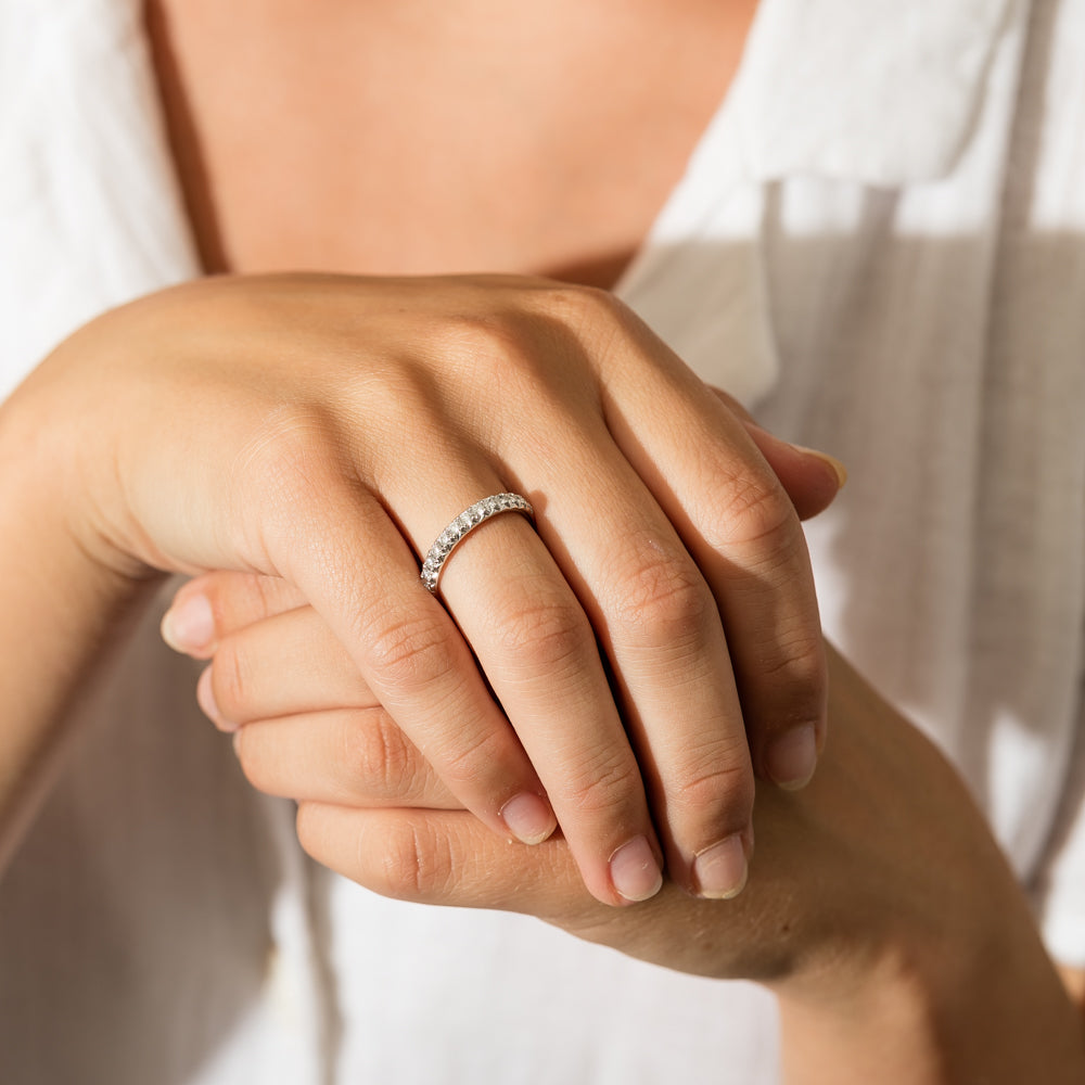Carefully crafted in 18ct white gold from our signature 1899 collection, this Meridien band is 3-3.2mm wide and features 15 claw set round brilliant cut diamonds.