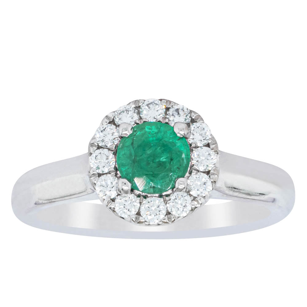 Embody sophistication in this timeless emerald and diamond ring. This striking ring boasts a bright green emerald framed by a sparkling diamond halo, set in 18ct white gold from our high palladium 1899 collection. An elegant ring that you will adore.