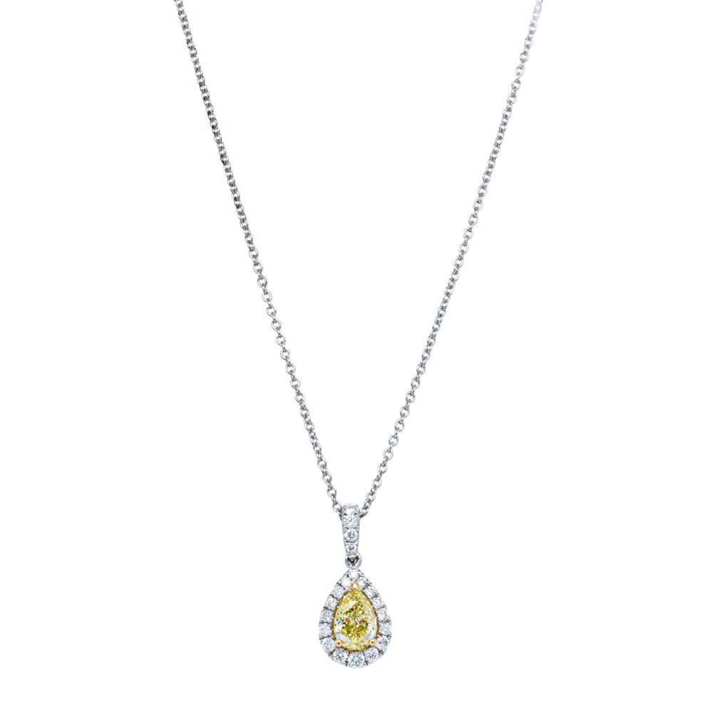 A pear cut yellow diamond is the centre piece of this elegant pendant, giving it a unique spin on a classic. A halo of round brilliant cut white diamonds is a stunning finishing touch.