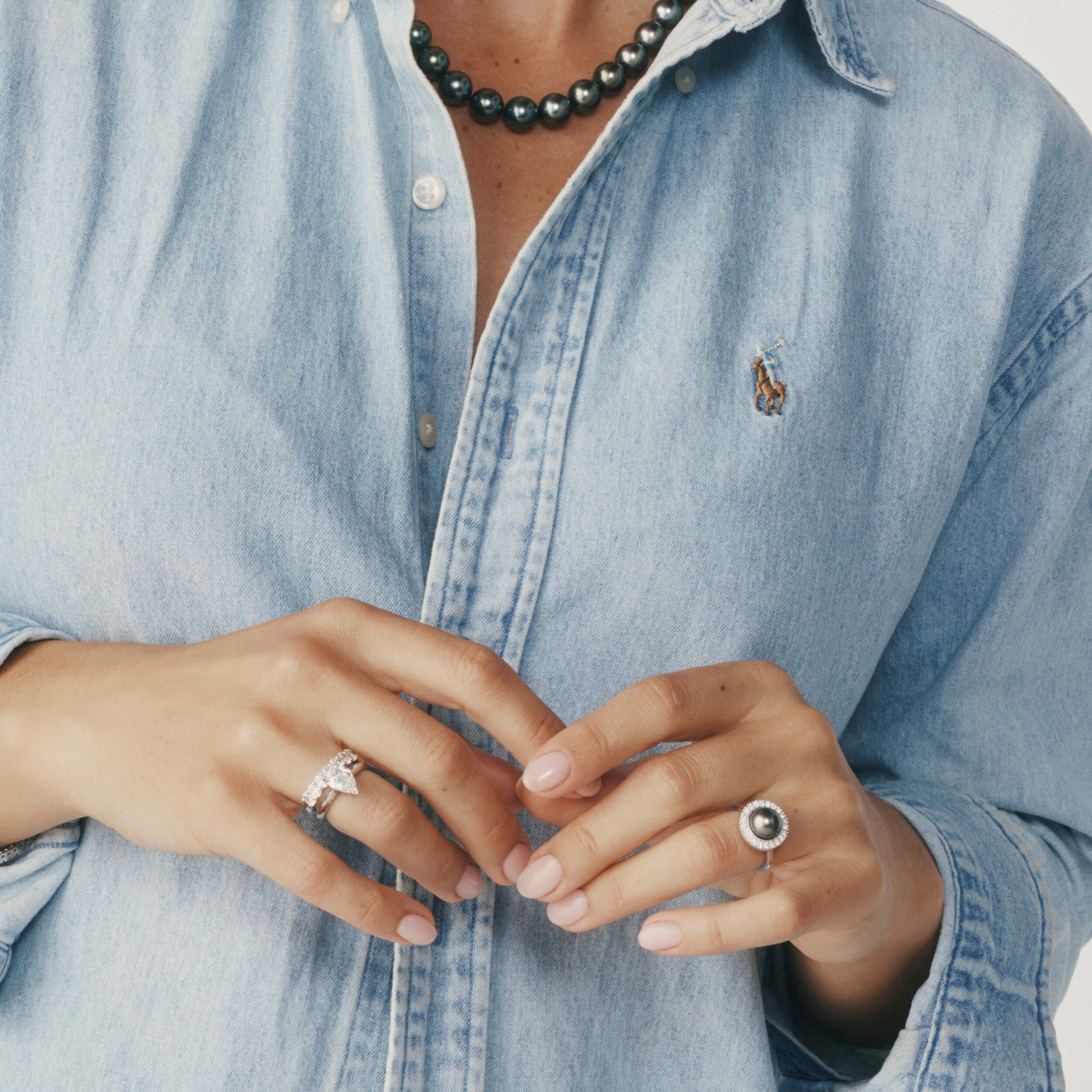 Classic and timeless, this beautiful Daisy ring boasts a black Tahitian pearl, accompanied by a halo of sparkling round brilliant cut diamonds. A simply breathtaking piece that you will adore wearing!