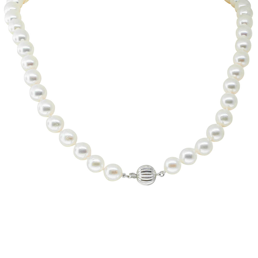 Pearl necklaces are the epitome of timeless beauty. This Akoya pearl strand necklace has a classic appeal with its individually knotted pearls and an 18ct white gold fluted ball clasp.