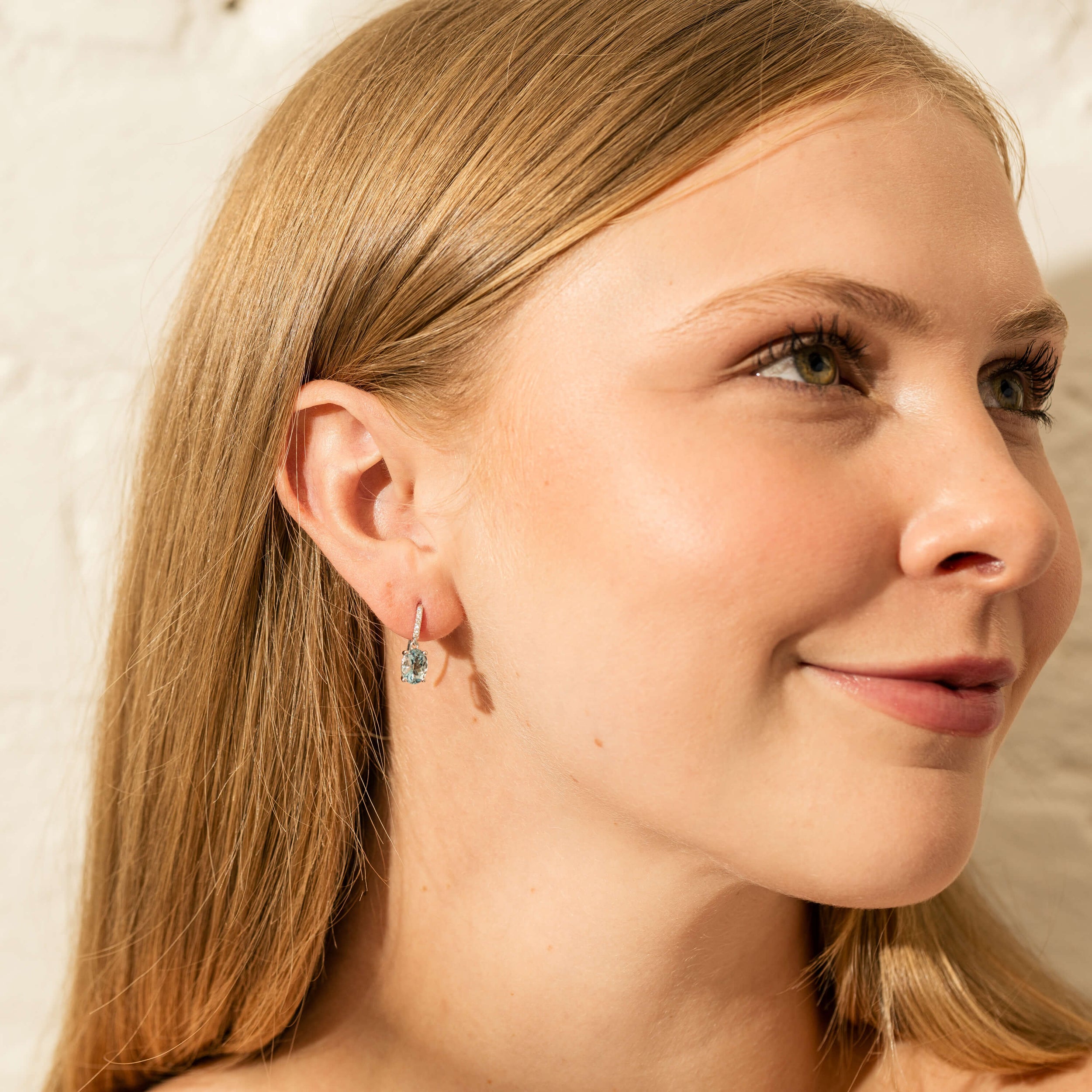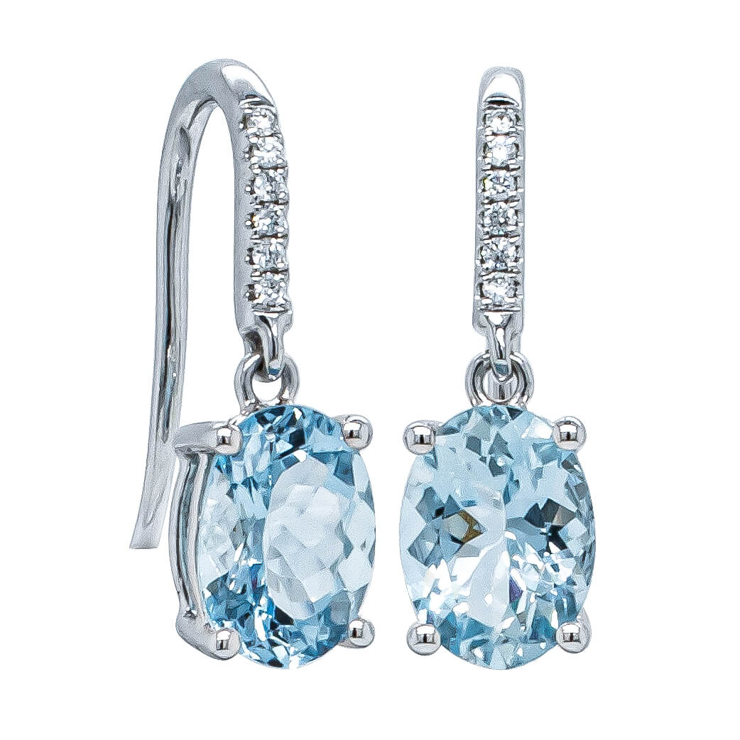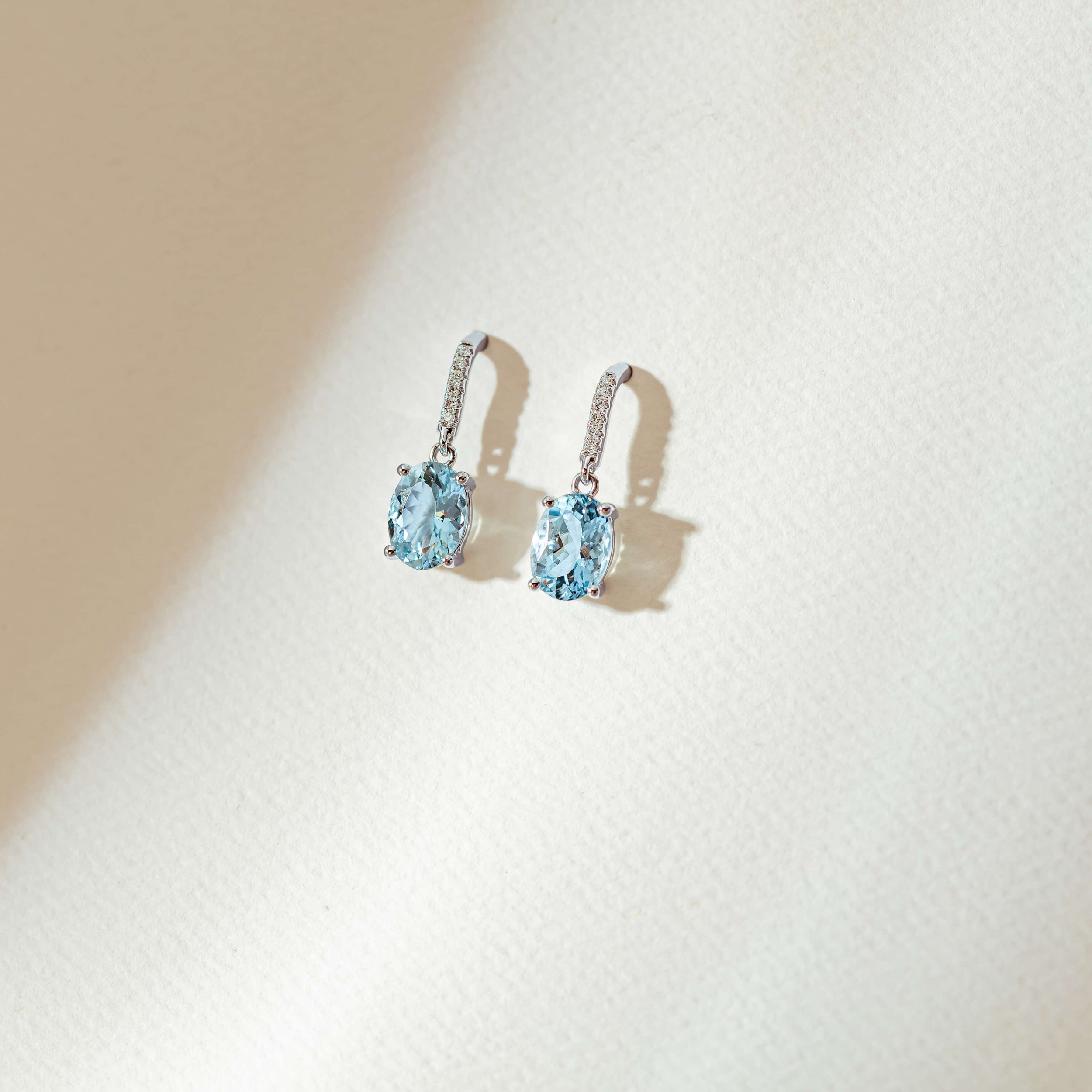 The Lulu earrings - a blend of elegance and grace. These earrings, from our signature 1899 collection, feature captivating oval faceted aquamarines four claw-set swinging on diamond set oval hooked earwires. The serene blue of aquamarines and the brilliance of diamonds create a refined design, ideal for any occasion.