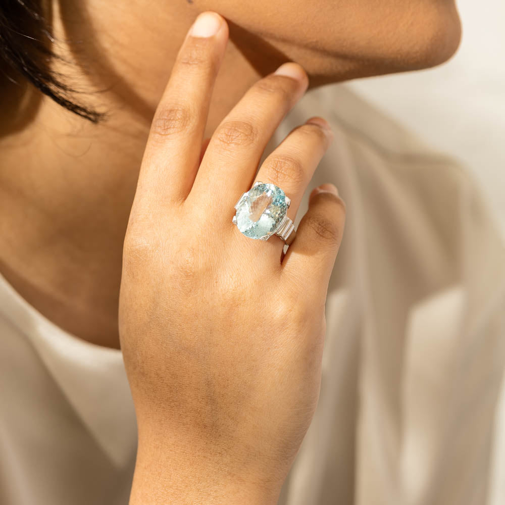 The name Aquamarine comes from the Latin word aqua marinus, meaning “water of the sea,” and refers to its sparkling ocean-like color. Boasting an oval faceted aquamarine with decorative shoulders, you will be the definition of beauty and elegance in this 9ct white gold ring.