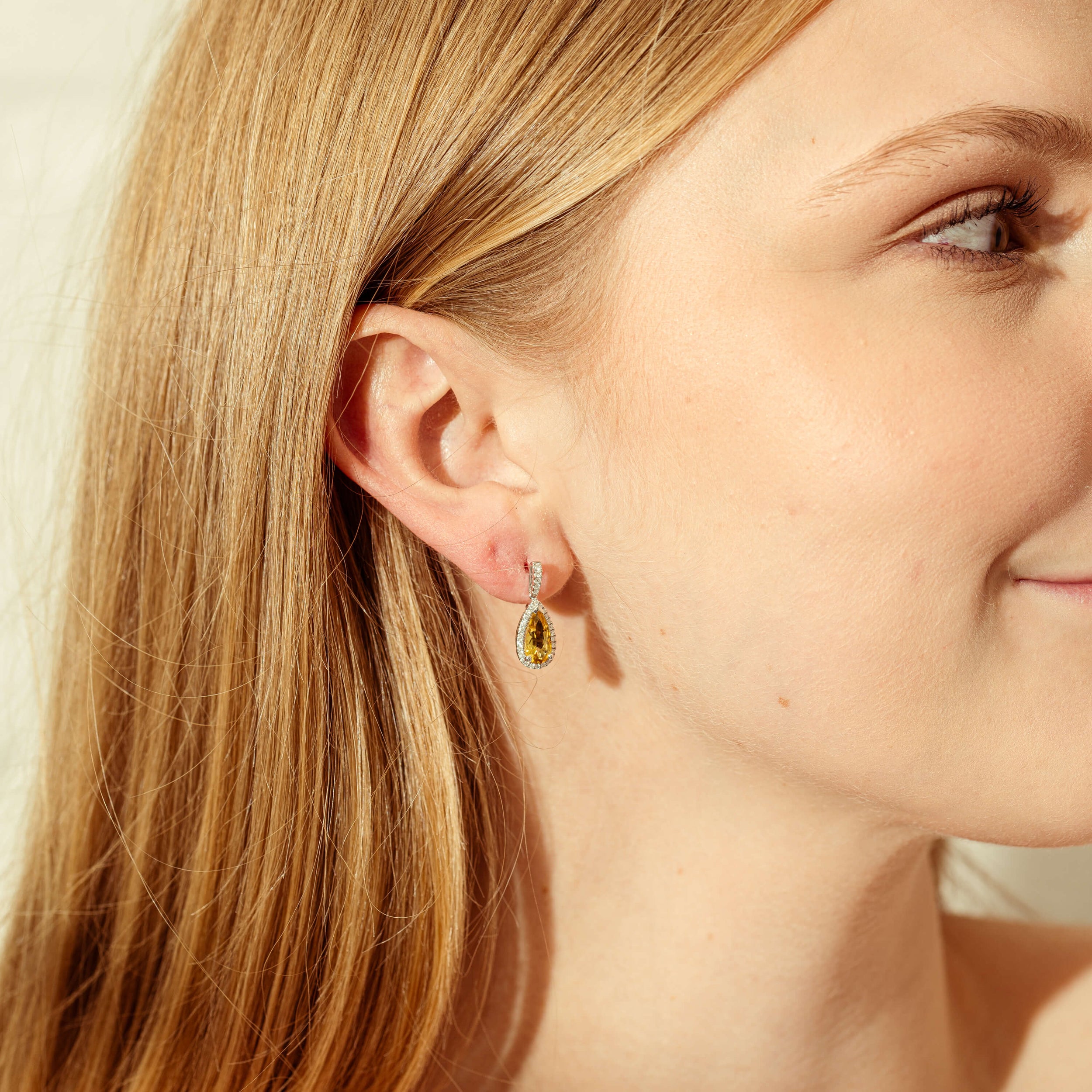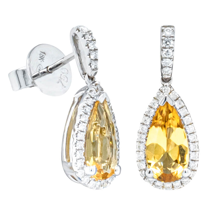 From our signature 1899 collection, these stunning earrings feature two pear faceted yellow Beryls and a diamond cluster setting. Carefully crafted from 18ct white gold.