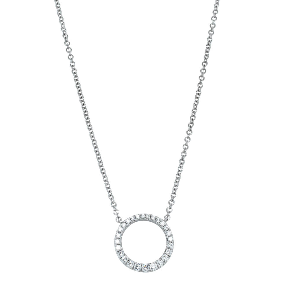 Aelia, her name of Latin origin meaning Sun. Representing the sun’s sphere of light, the endless curve of diamonds forms a perfect circle, suspended from a dainty cable chain.