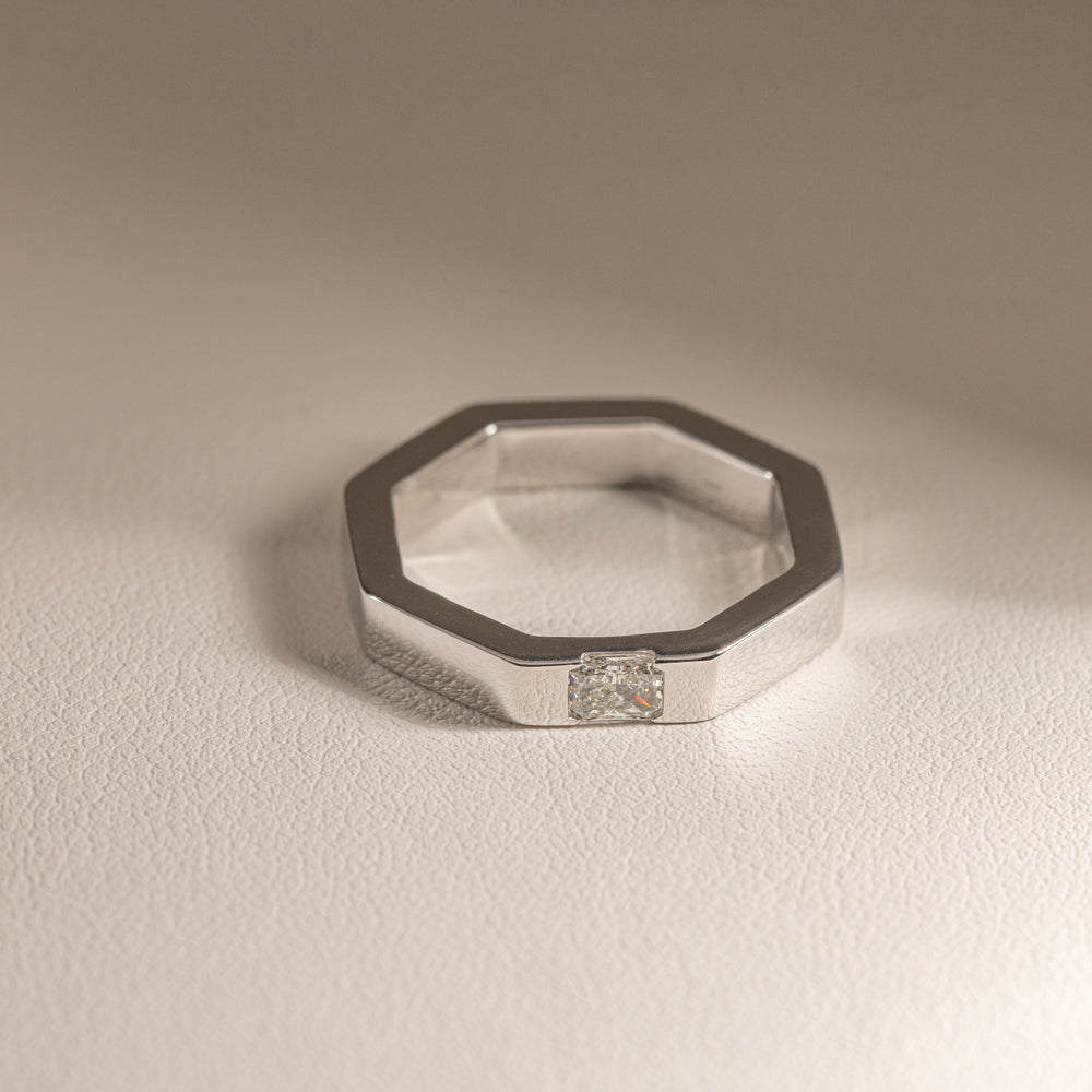 A symbol of love eternal. This ring from our signature 1899 collection with high palladium consists of an octagonal band and is flush mounted with a radiant cut diamond.