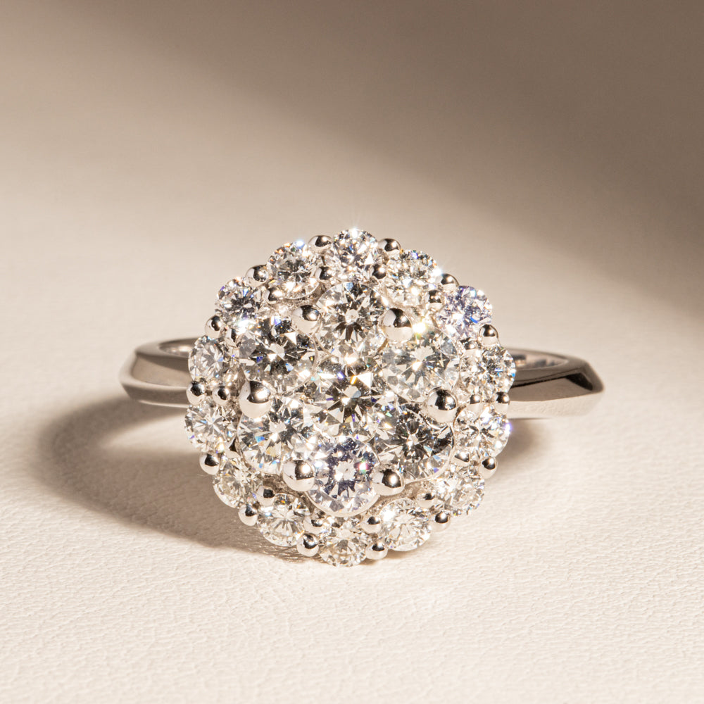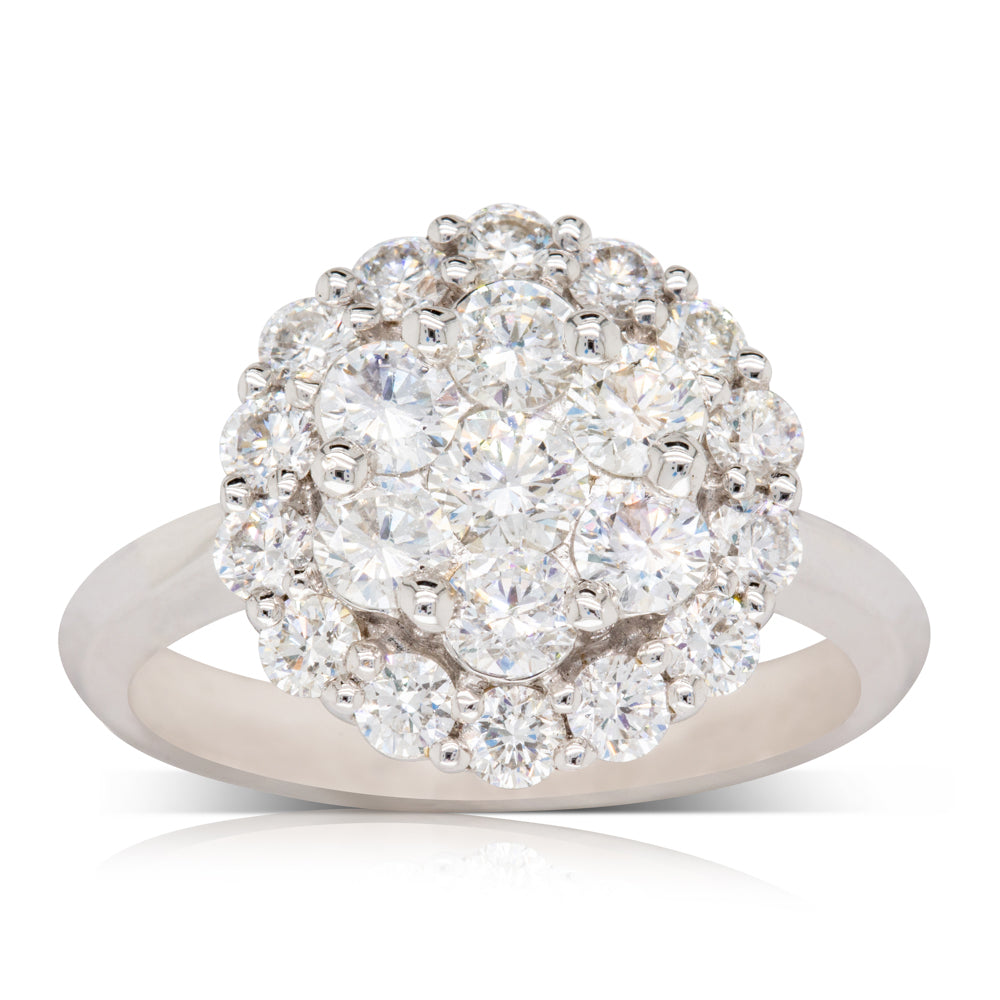A bouquet of diamonds! You will adore this beautiful ring as it sparkles from every angle. Crafted in 18ct white gold, this stunning ring shimmers with twenty one round round brilliant cut diamonds set in a three tier cluster setting.