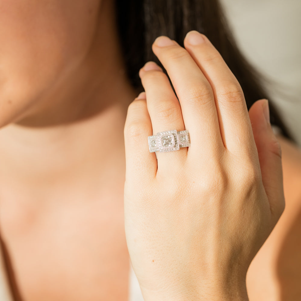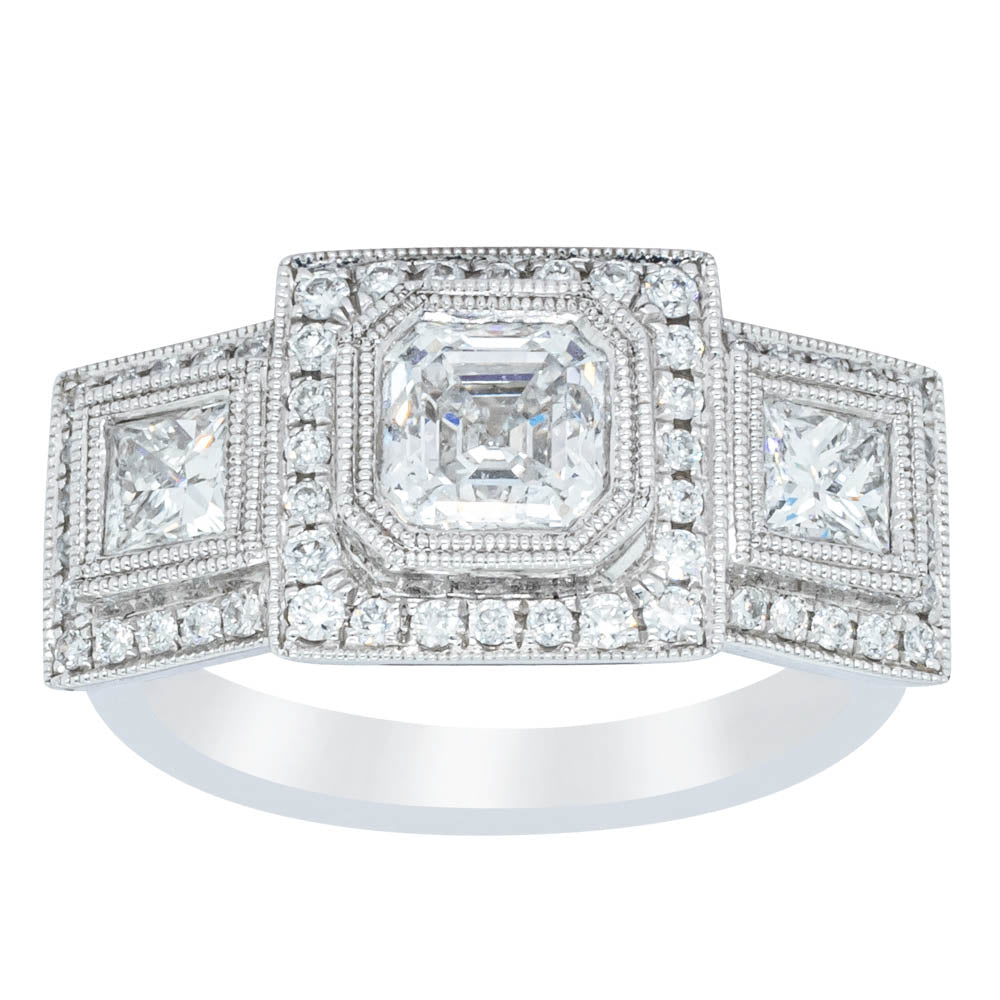 Triple the sparkle! This glittering diamond ring features an exceptional square emerald cut centre diamond resting in a raised millgrain setting. Twinkling princess cut diamonds frame this spectacular diamond on either side, surrounded by shimmering round brilliant cut square clusters!