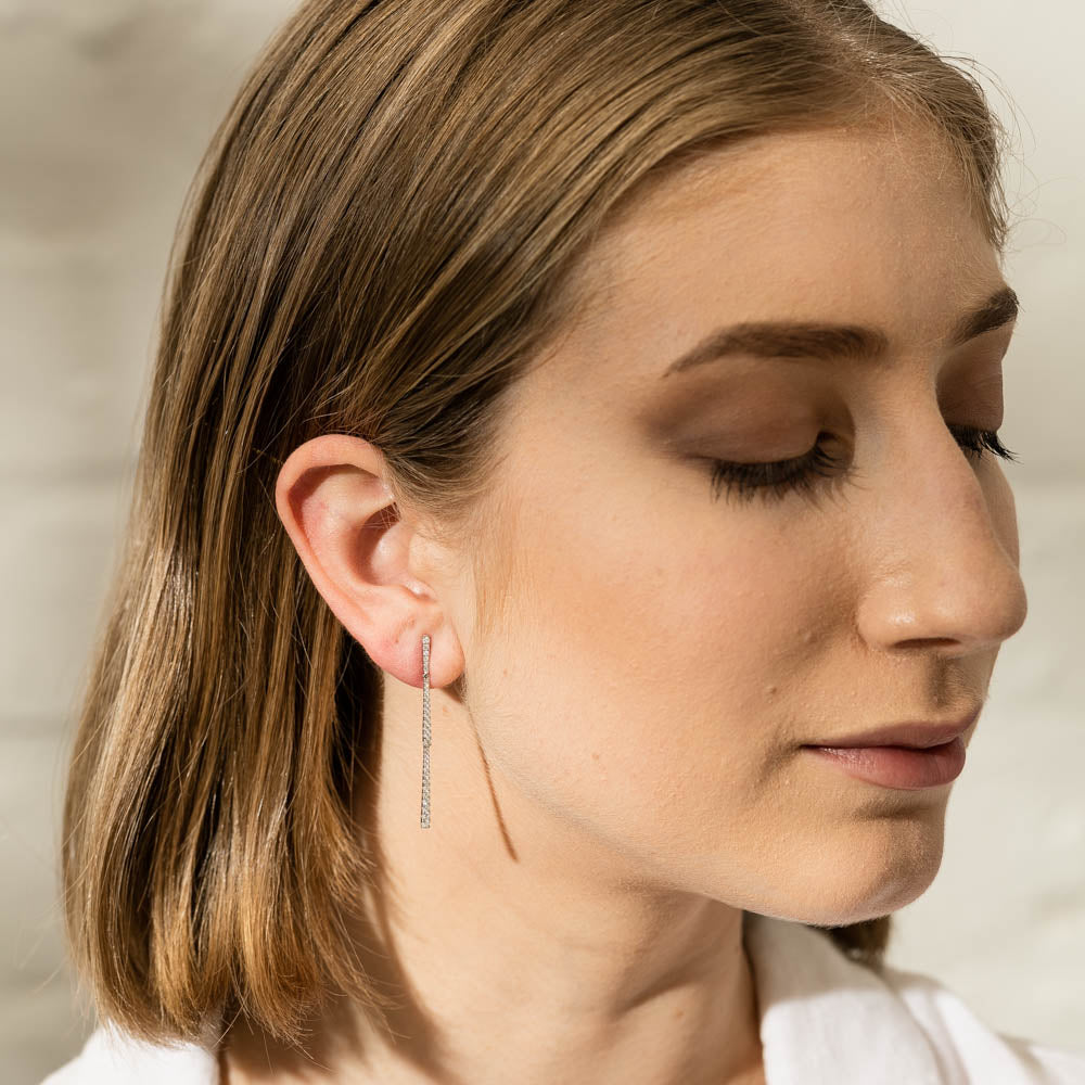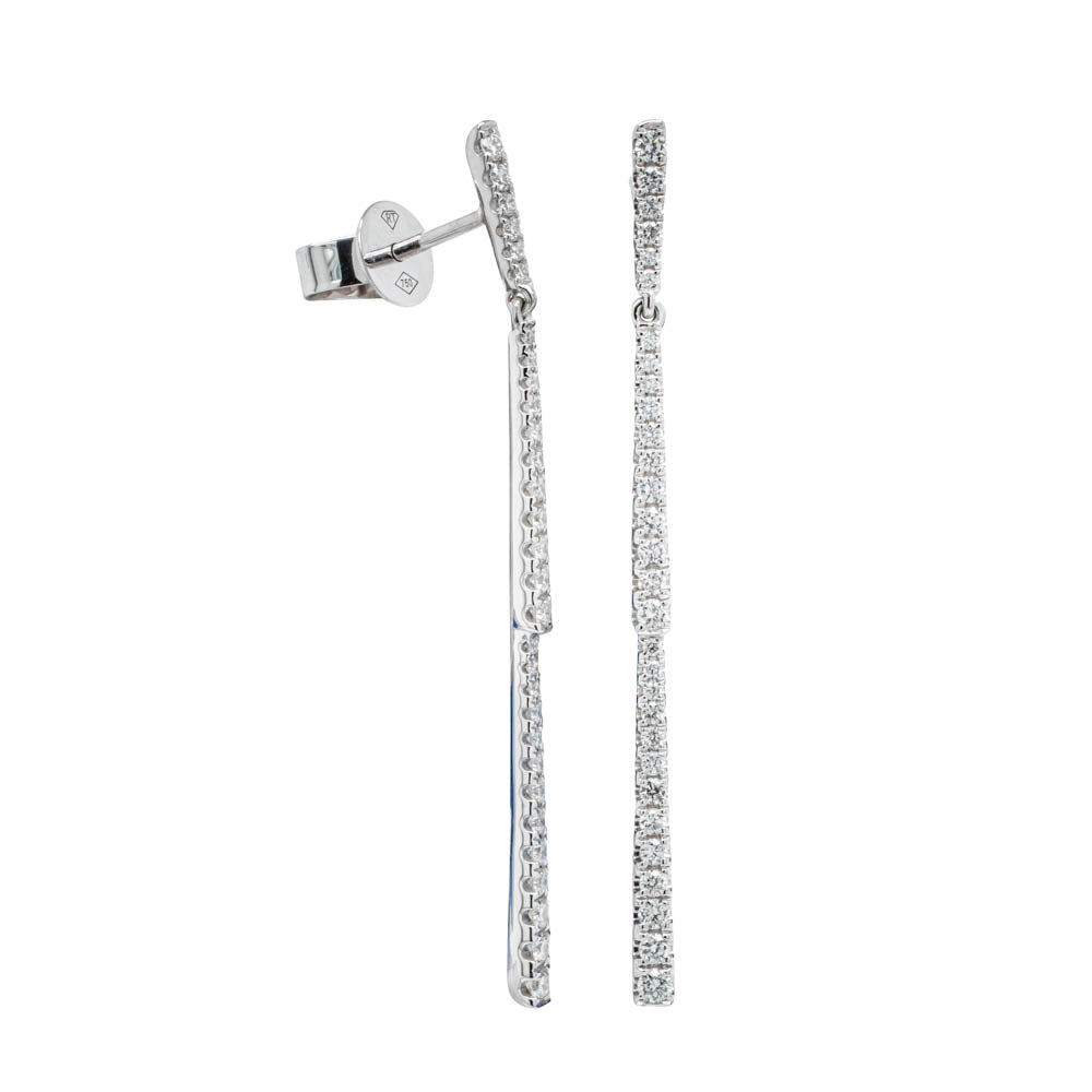 18ct white gold earrings featuring sixty round brilliant cut diamonds suspended from 18ct white gold setting and secured with post and butterfly fittings.