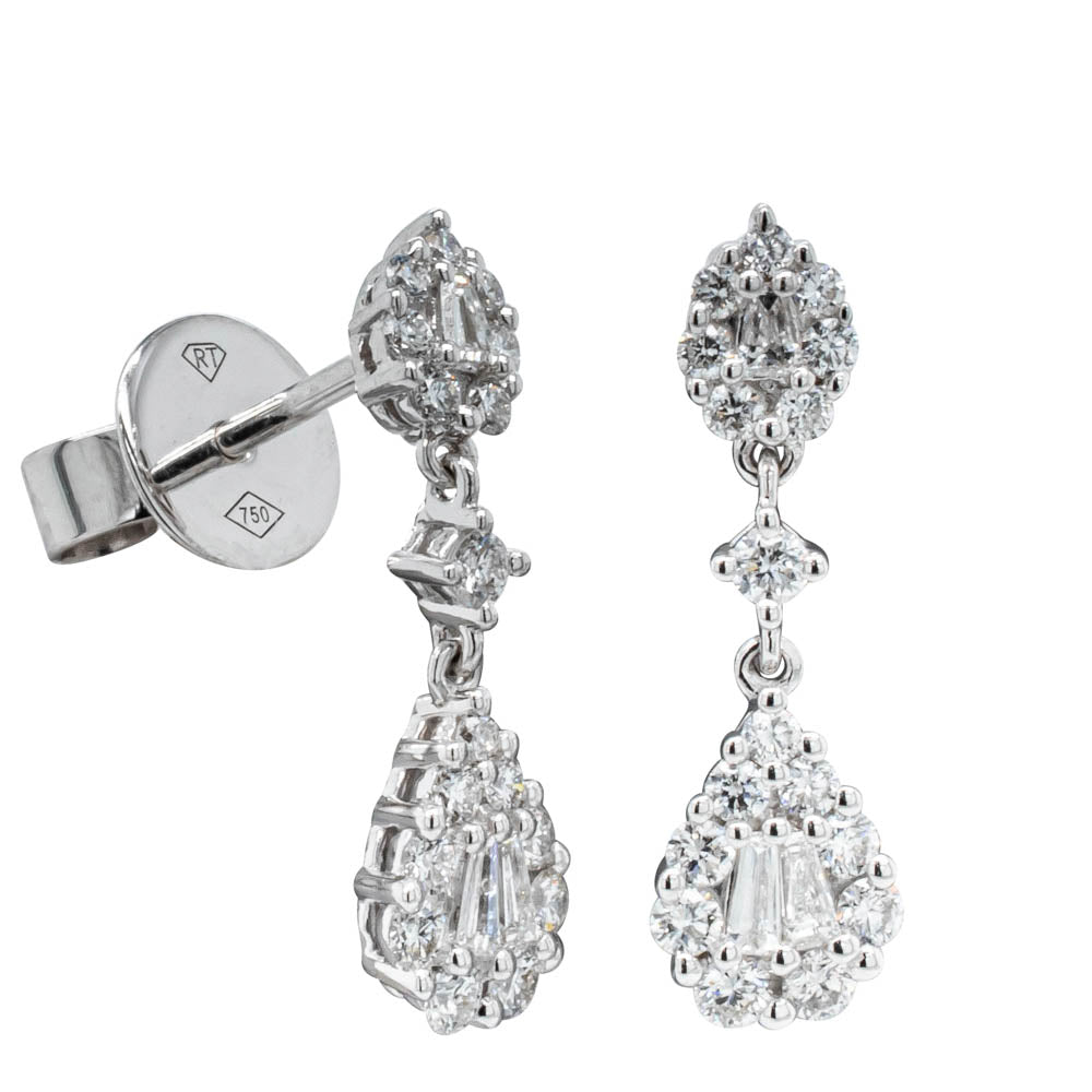 Dazzle in these sparkling 18ct white gold and diamond drop earrings. These sparkling earrings feature round brilliant and taper cut diamonds.