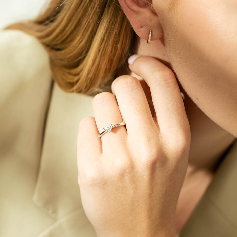 The perfect symbol of your love... crafted from beautiful 18ct white gold this adorable piece boats a shimmering heart brilliant cut centre diamond which rests in a three claw heart shaped setting. With narrowing shoulders to complete a vision of elegance this is the perfect ring for the perfect girl.