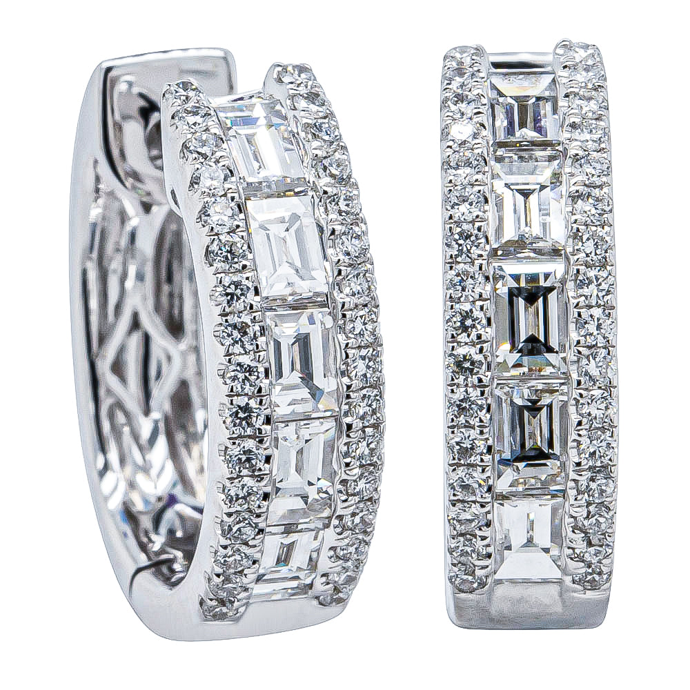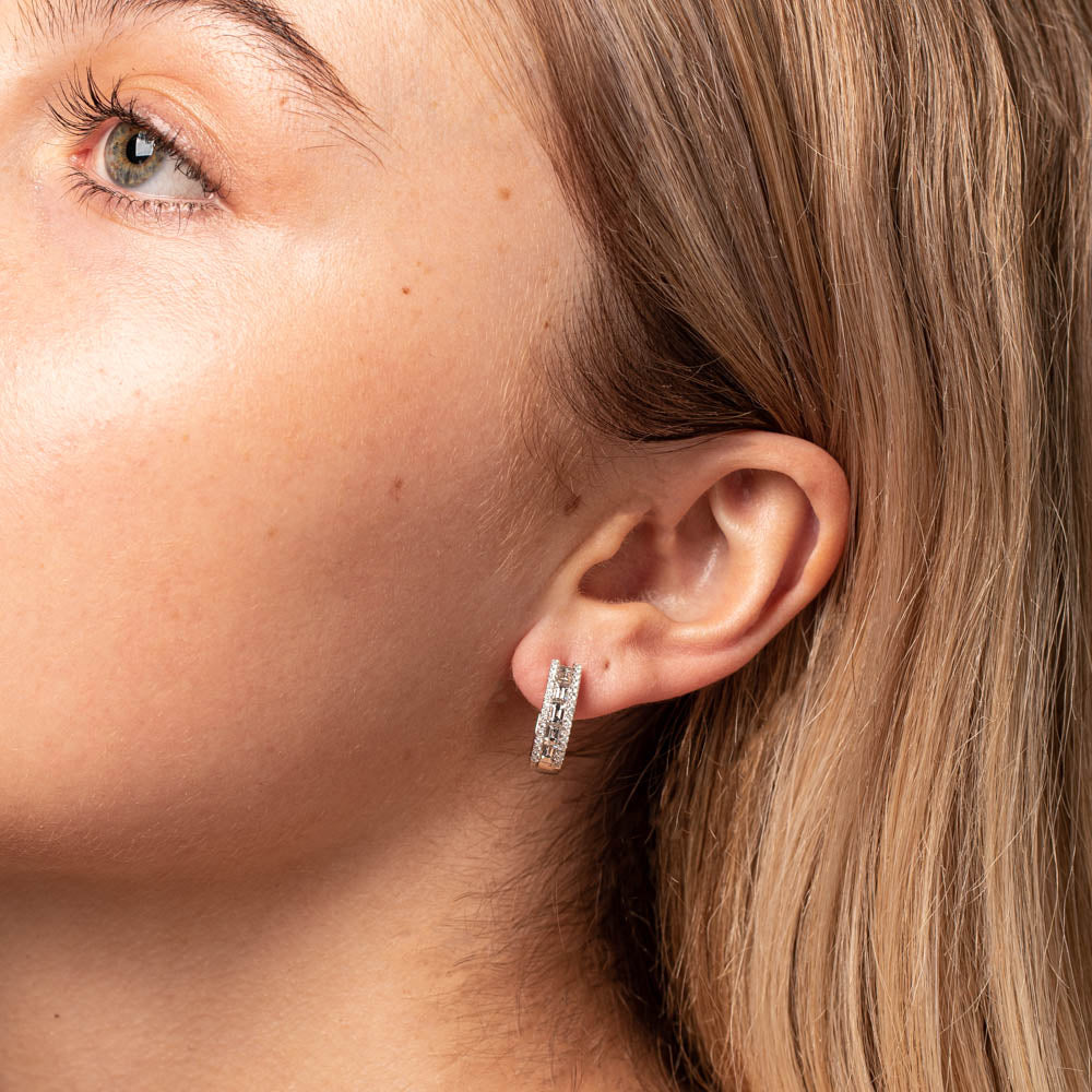 This precious pair feature a central line of baguette cut diamonds framed by shimmering round brilliant cut diamonds. Crafted from luxurious 18ct white gold, these will soon become your signature pair!