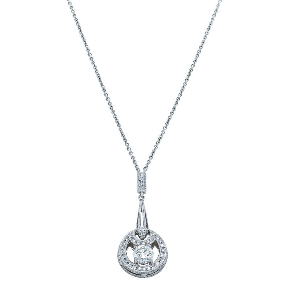 Simply stunning! This graceful diamond pendant is crafted in 18ct white gold and boasts an impressive round brilliant cut diamond framed by a glittering diamond halo. Light up the room in this dazzling pendant.