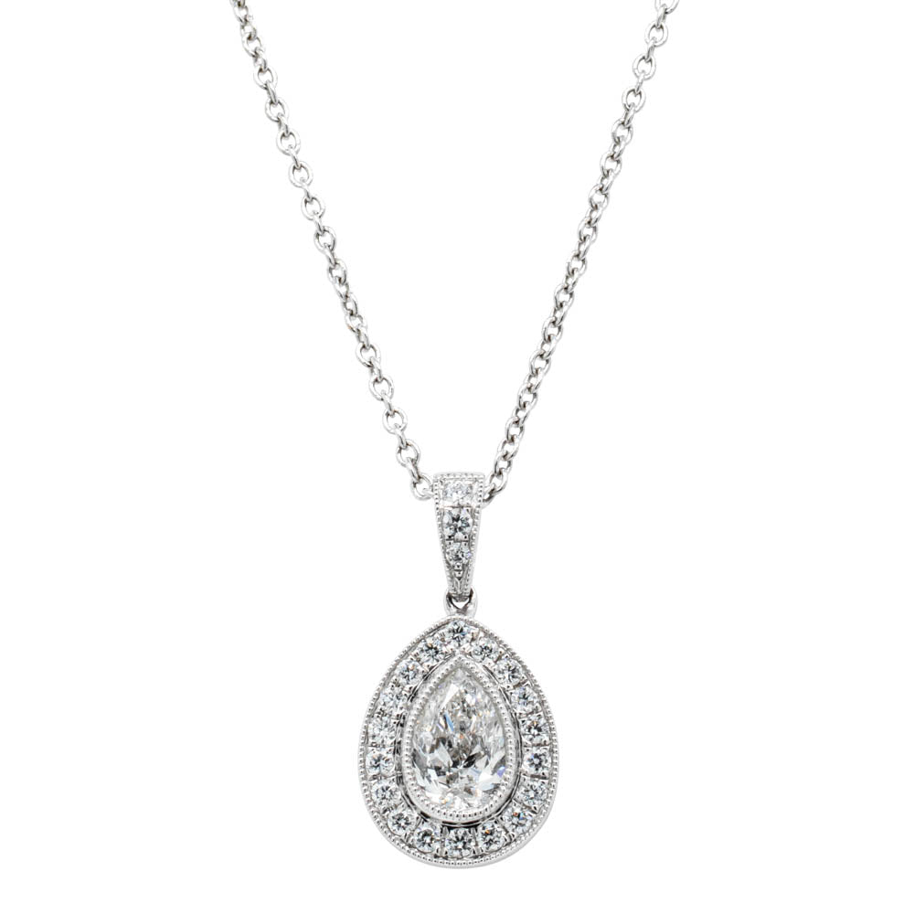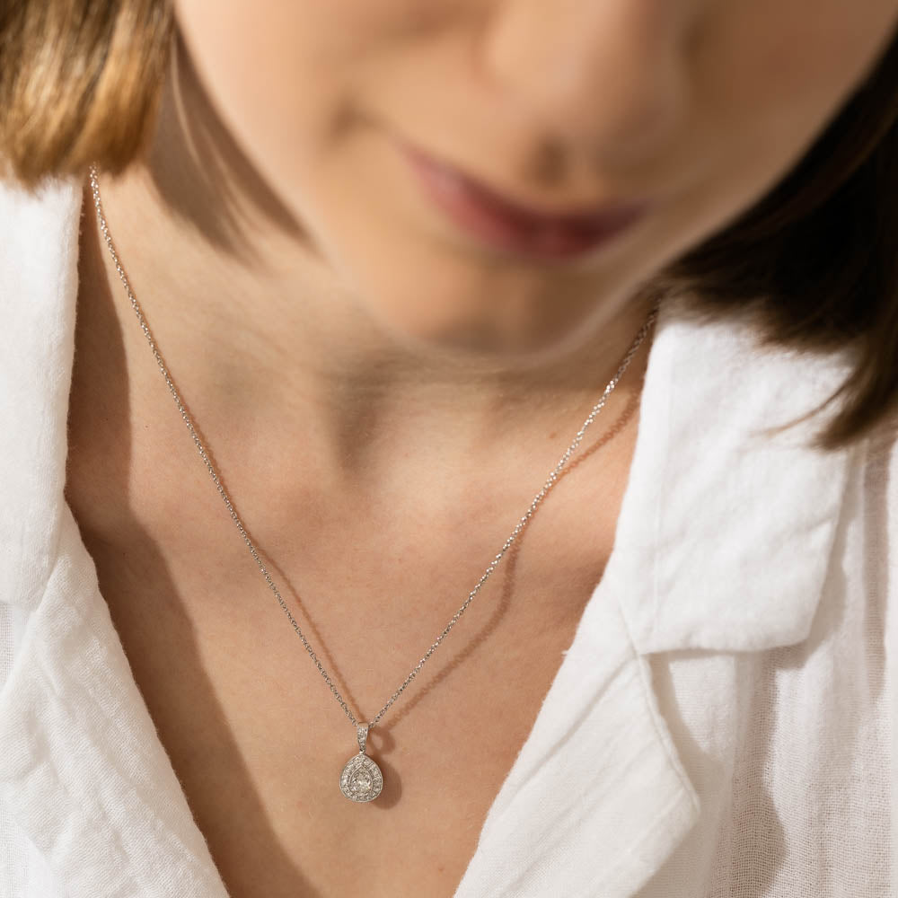 Elegant in every way, this diamond pendant features a single pear faceted diamond framed by round brilliant cut diamonds in our 18ct white gold.