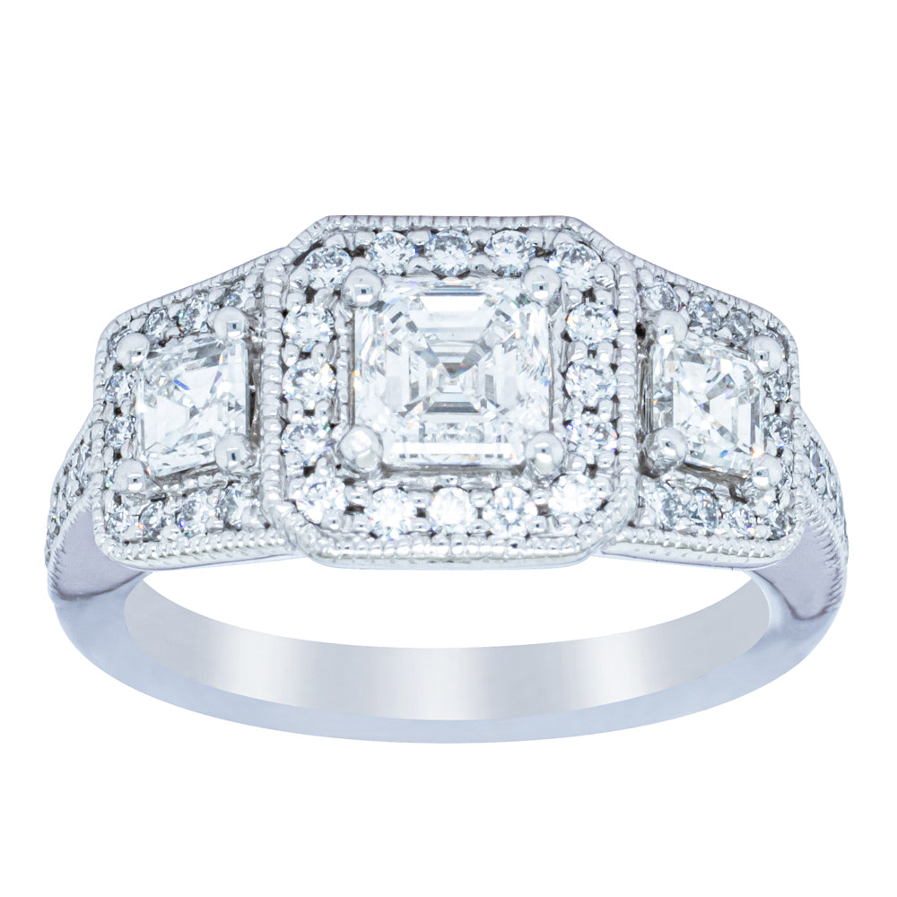 18ct White Gold Emerald Cut Diamond Triple Halo Ring