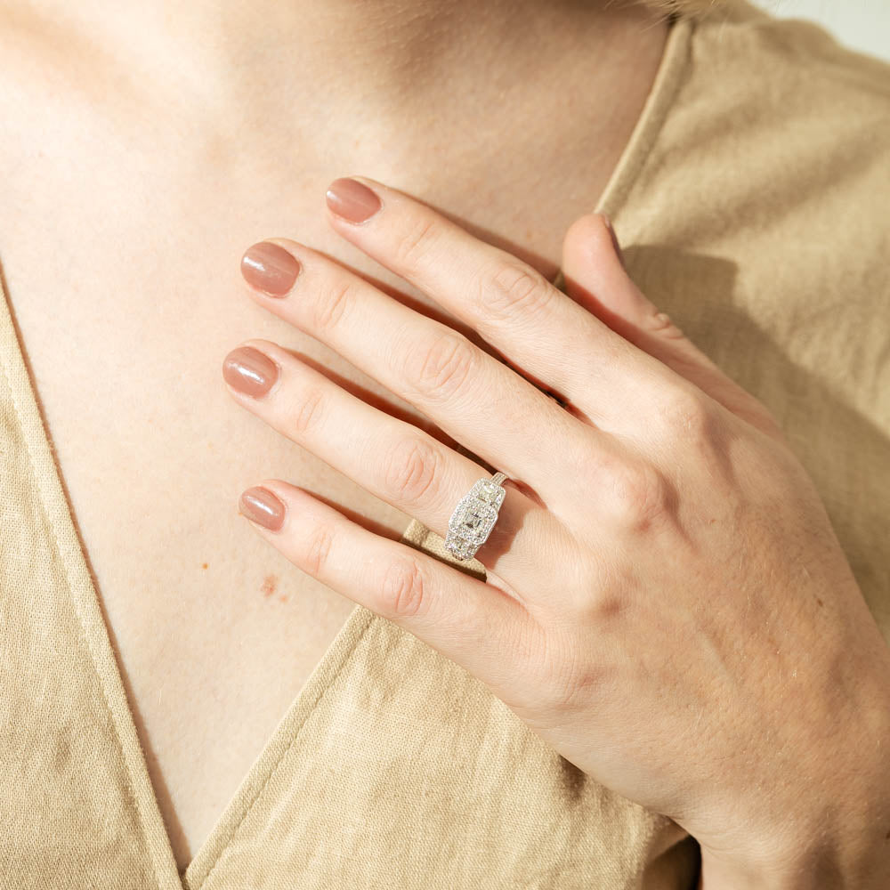 She will dazzle in this sparkling diamond haloring. Boasting three emerald cut diamonds set in 18ct white gold, she will fall in love with this majestic ring.