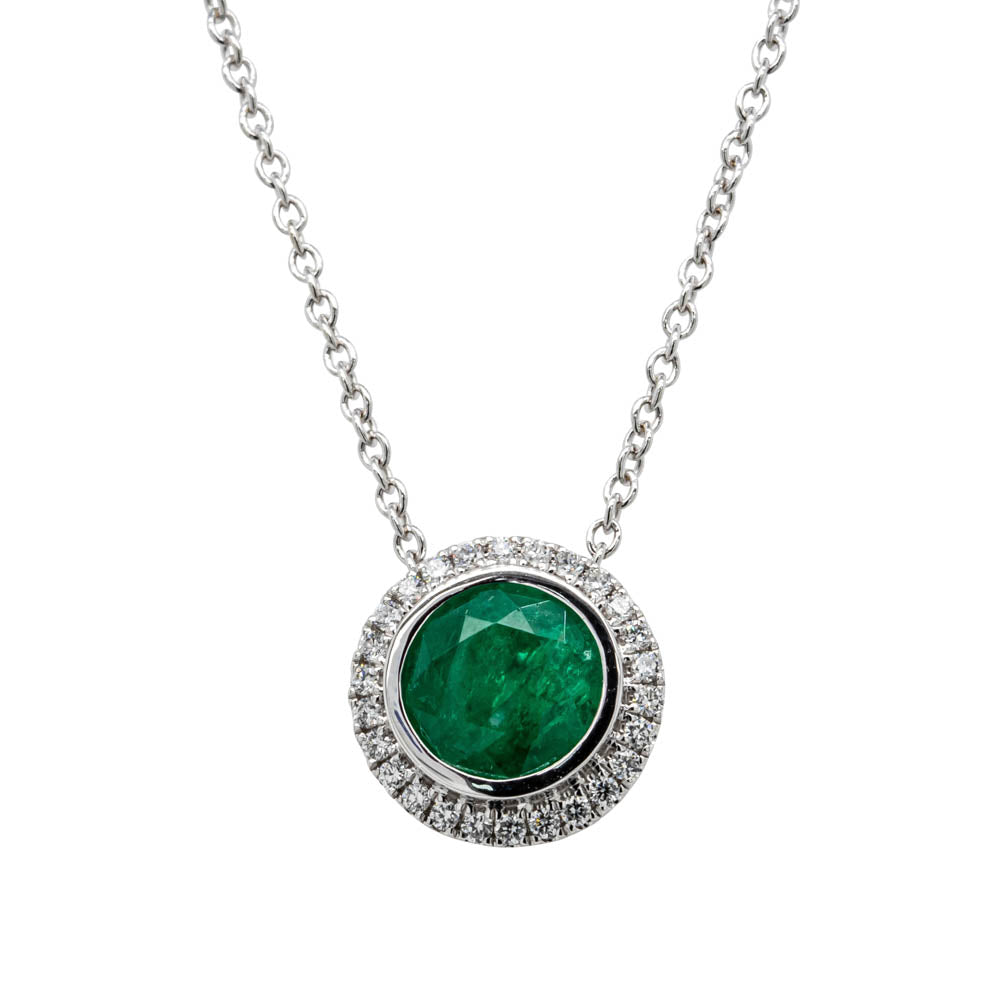 Elegant in every way, this emerald and diamond pendant features a round faceted emerald framed by twenty six bead set round diamonds in our 18ct white gold.