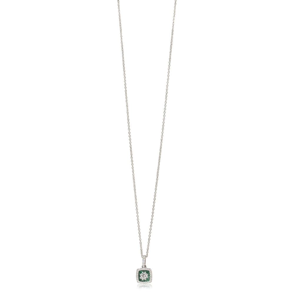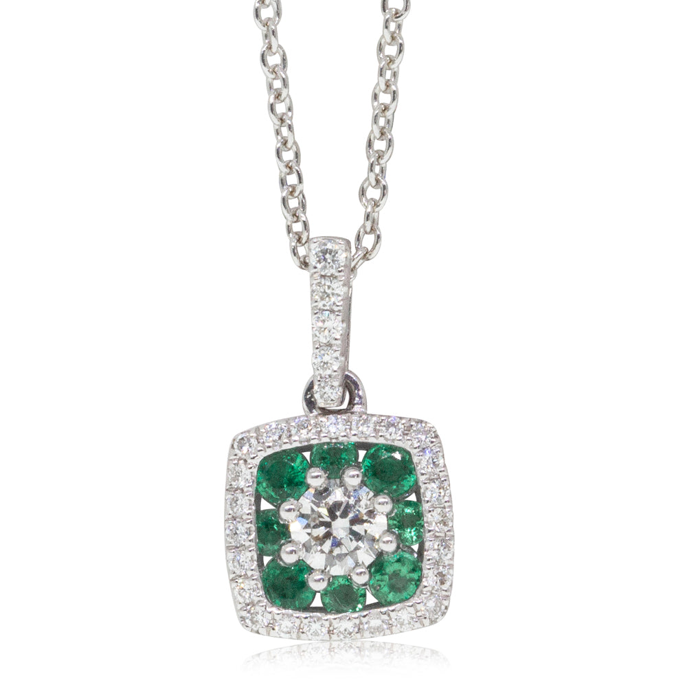 18ct white gold pendant boasts one round brilliant cut centre diamond framed by eight strong green emeralds & twenty nine glistening diamonds.