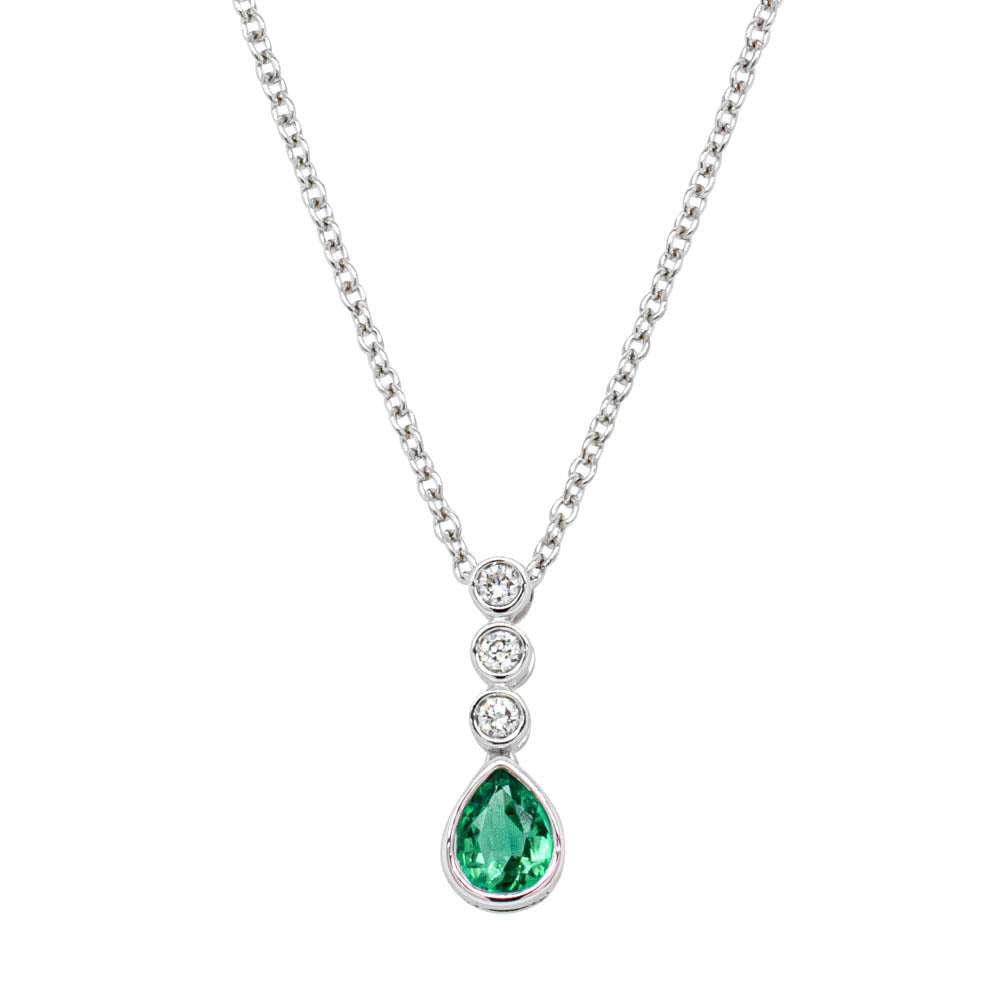 Elegant in every way, this emerald and diamond pendant features a single pear faceted emerald set below three rub over set diamonds.