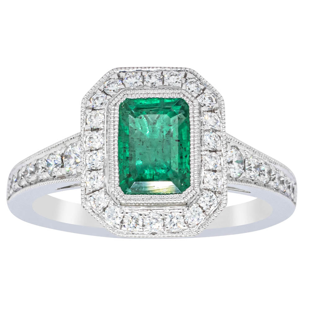 This exquisite ring from our signature 1899 collection boasts one impressive rectangular step cut vibrant green emerald framed by a glittering diamond halo! Further diamonds are set around the base & on the shoulders of this precious ring.