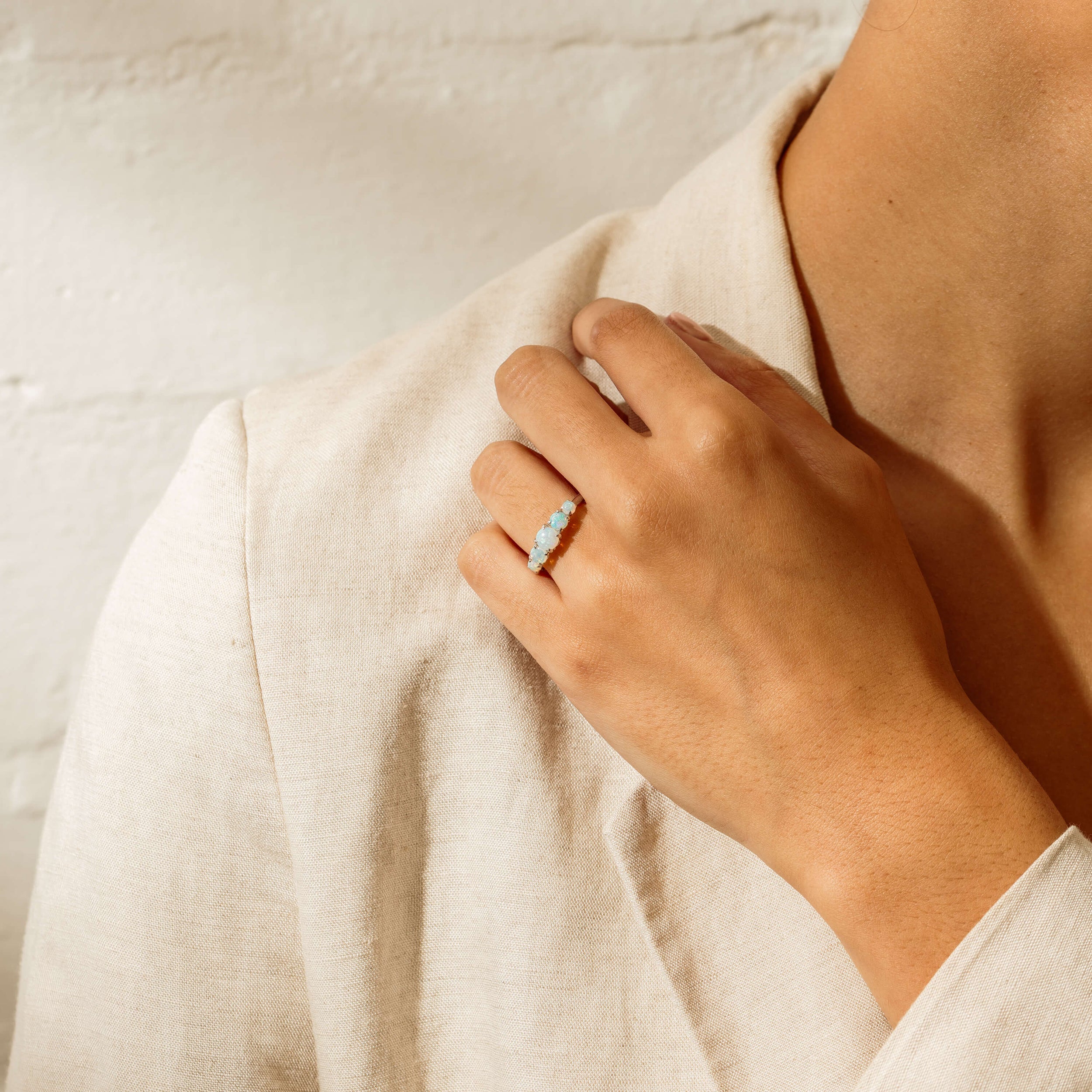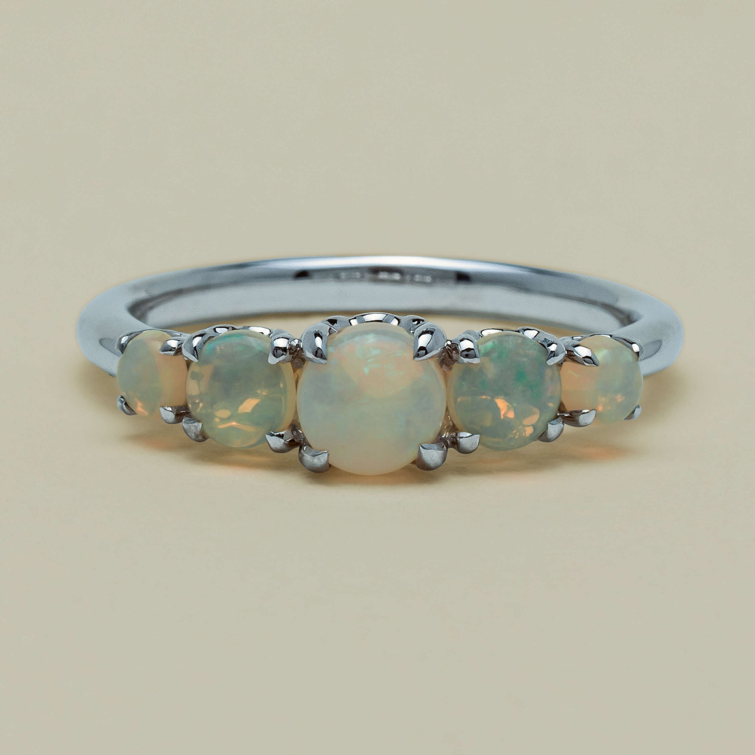 Carefully crafted in 18ct white gold from our signature 1899 collection, this stunning Octavia ring boasts five round cabochon opals resting in elegant petals. Elevated above a classic band, each opal sits proud and open to the light which will show off its play of green and blue colours. Simply stunning!