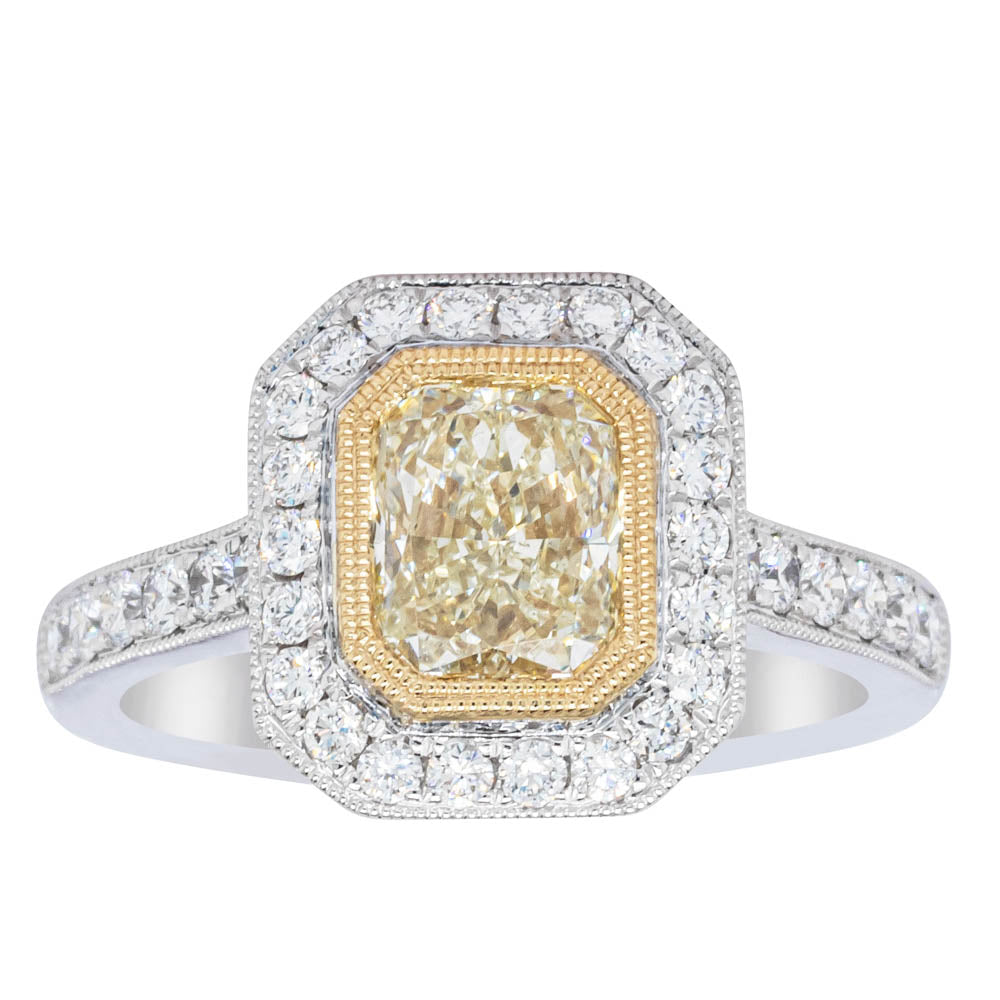 18ct white gold ring from our signature 1899 collection featuring one yellow radiant cut centre diamond framed by a halo of dazzling white diamonds resting on diamond set shoulders.