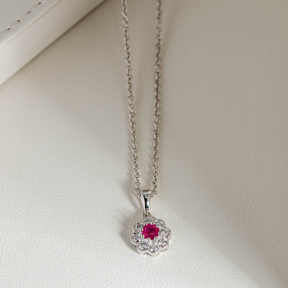 Crafted to perfection in 18ct white gold this gorgeous pendant features a round faceted ruby framed by a halo of round brilliant cut diamonds. Swinging from a tapering bail, this beautiful pendant is perfect for you.