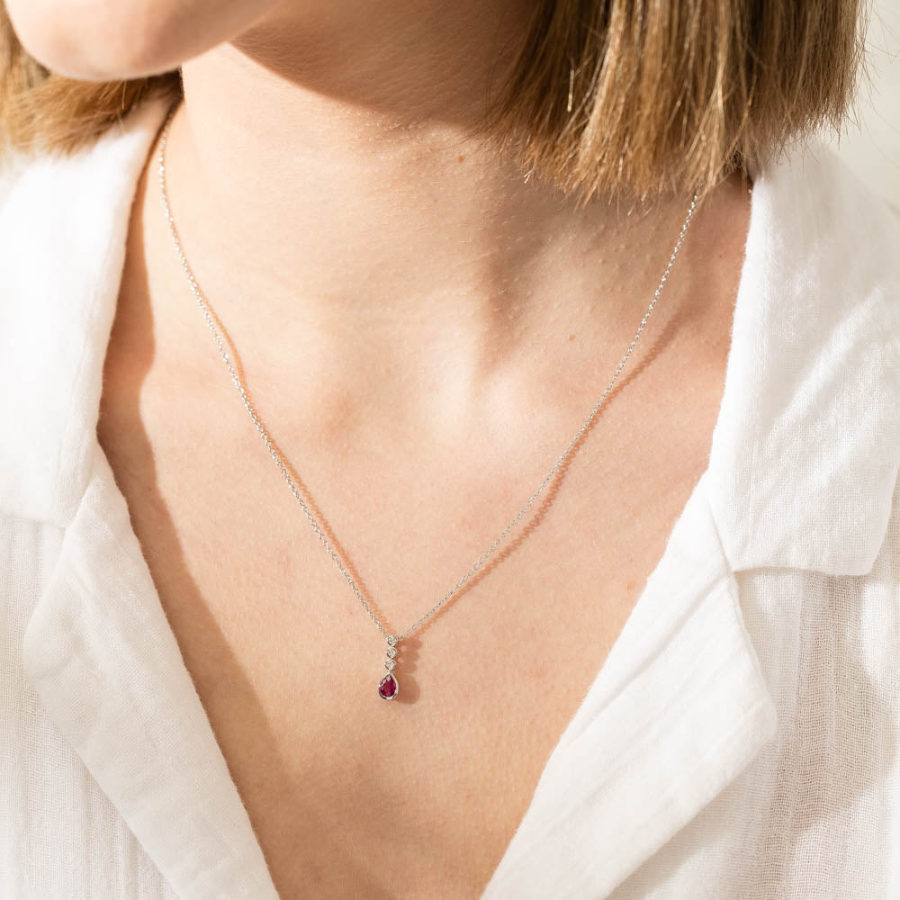 Carefully crafted from divine 18ct white gold, this shimmering piece features a pear faceted ruby swinging on a diamond set bail.