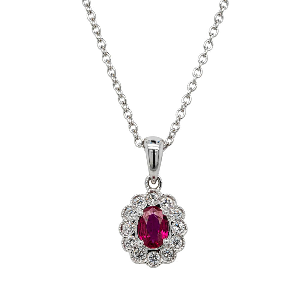 Carefully crafted from divine 18ct white gold, this shimmering piece features an oval faceted ruby resting inside a shimmering diamond halo.
